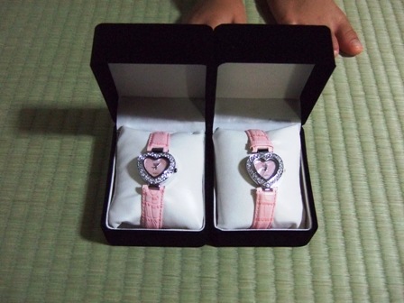 ピンポォ~ン 今日も我が家に郵便屋さんがやって来ましたちょめりさんとかりなつさんからじゃありませんの?ちょめりさんからは、以前カウプレで頂いた「ハートきらきら腕時計」をぬわぁんとっもう1つ「娘も私もハートが大好物」と話したら・・・「引っ越し祝いだよ」ともう1つ送ってくれましたこれで娘と喧嘩にならなくてすむわぁ~むむむっ・・・娘がまたしても狙っている・・・わぁぁ~ とられたぁ~ そりゃないよ娘ちゃん・・・1個は返しておくれちょめりさん いつもいつもいつもいつもいつも ありがとねぇ~ 続いては昨日交換のお披露目をしたばかりのかりなつさんがオマケのお返しとハイソックスとヘアゴムセットをわざわざ送ってくれましたオマケのお返しなんてとんでもないです!!交換のお品も、気が付けば倍ほどの金額差があったのに・・・うれしくて、涙ちょちょぎれてます ちょめりさん かりなつさん ありがとぉ~っお見せできないのが本当に残念だけど・・・足向けて寝ませんっ!ん?西はどっちだ?北はどっちだ?