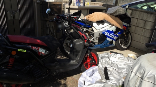 ついにお誘いを断ることができず。先週も誘われてたんですが、土曜日は習い事があるのでダメ、ってことで断れたんですが、今回はなんか断りにくくて。 あれだ、もうすぐ還暦リターンライダーのおっさんとのツーリング。 ・・・。 まあ、ちょうどいい行き先があるのでそこまでは一緒に行くことにしました。そう、毎月の恵方参りが残ってます。「神社に行くだけですけどいいですか?」 これで断ってくるかと思ったけど、そこでいい、ってことだったんで断れなかったというか。日曜日の朝、ちょろっと散歩です。 本当はスクーターで行こうと思ってたけど、相手が大型なら自分もGSXをじゃないと無理です。じゃあ、整備に出すときに換えていたヘッドライトバルブはLEDに戻しておくか。 金曜日だったので6時前にあがりました。なんとか渋滞になる前に帰宅。まだ外は明るいので少しだけバイクをいじります さすがに隣にスクーターがあると作業がしにくいな。2台の間をおなかを引っ込めながらくねくね動いて作業。なんとかバルブを交換しました、が。 もうこの時期、とにかく蚊がすごくて少しの時間の作業だったけど数か所被弾。蚊を払いながら作業したのでしっかり作業できたか微妙。 点灯チェック。OKそうです。 マフラーも・・・、行く?まだ十分明るいけど蚊の飛び回る季節になりました。蚊も飛ばない超炎天下ならOKだけどそれはそれで嫌。まあ、今回は見送りです。 あとはタイヤの空気圧をチェック。さすがに作業スペースがないのでスクーターを後退。なんかGSXを追いかけてるような構図。 空気圧は高いな、規定値を超えてる。いきなり気温が上がったから補充されたころの空気が膨張してるのか。最近は規定値で乗ってますが、さすがに抜きます。 これで日曜日の準備は完了。 だけど困ったな、どちらのバイクもオイル交換したばかり。添加剤を入れたいけどこんなに蚊が飛んでると。今回の添加剤はバーダルです。