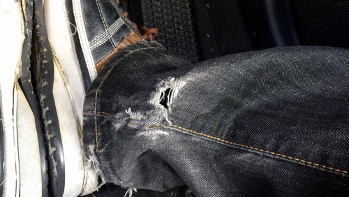 持ってるジーンズはたいていここに穴が開きます。心当たりはこれしかないです。バイクのステップ。