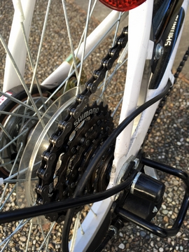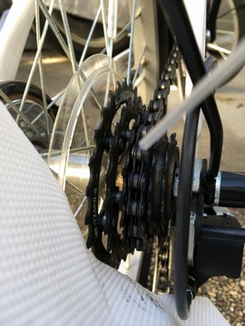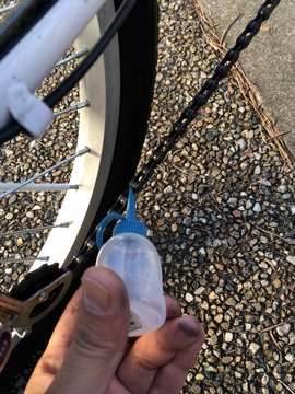 安物の自転車用オイルを塗布。余分なオイルを拭きとって、各段のギアに切り替えてオイルをなじませます。