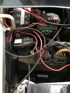 装具を脱いで家に戻って、クルマのキーと工具、ブースターケーブルを持ち出して、んでバイクのシートを外します。そしてクルマのエンジンフードを開けて、エンジン始動。ブースターケーブルをつないでバイクのエンジン始動。そのあとケーブルを外して、クルマのエンジンカット、バイクのシートを組み戻し。工具とケーブル、キーを戻しにもう一度家に。