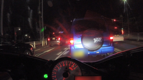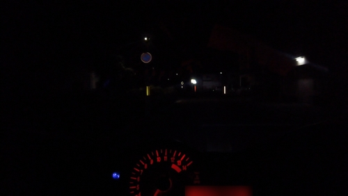 信号で前のクルマへの投光具合を確認。まあ、運転席を照らし出して、マイケルジャクソンのスリラーPVになってないのでOKとします。