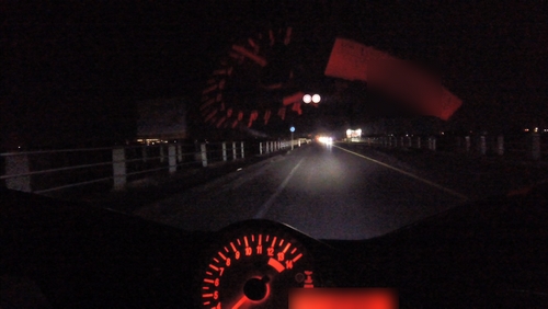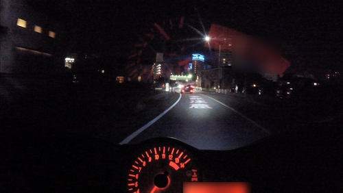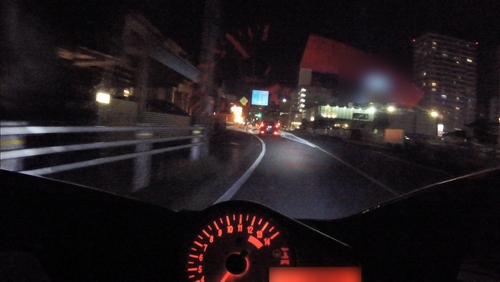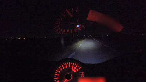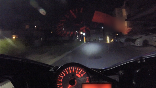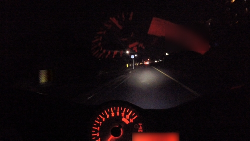 街頭なんかがあるとヘッドライト単体の明るさの確認ができないので、郊外に向かいます。その前にちょっと住宅街みたいなところも走ってみて、ハイ、ローを切り替えて路肩の見え方なんかも確認。ロービームはよく見える。