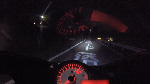 上部標識も明るく反射してる。知らなかったけど標識、案内なんかを照らす用のゾーンⅢという光域があるらしく、そこにもライトの光は飛んでるっぽい。後ろのクルマははるか後方だったので自分のバイクが照らしてるんだと思います。これなら山中とかで夜間の標識も視認できると思います。