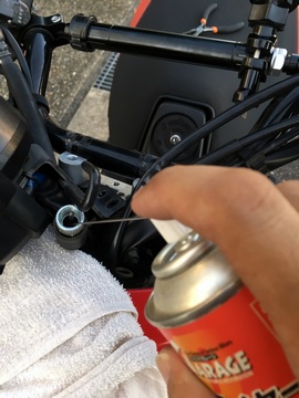やべ、多分ワイヤーオイルのノズル、刺さってたとこ違うんじゃないかな。シースのほうに刺してた可能性大。なんだよ、ワイヤーに注油じゃなくてアウターシースに吹き付けてたのか。