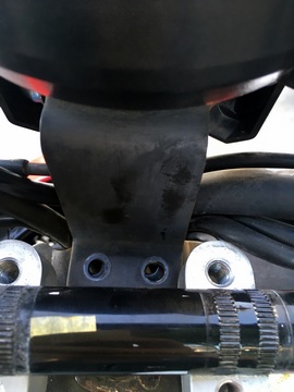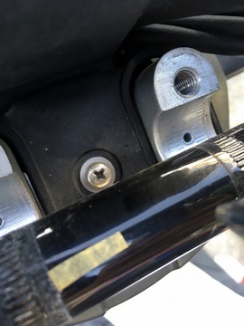 イメージはメーターを上に浮かせてケーブルを抜く作戦。だけどメーターを固定してるボルトにアプローチするには・・・、ハンドルを外さないとダメそう。ハンドルクランプのボルトキャップを外します。 うっ・・・、ピキって音がした。よく見ると割れてます。内装はがしが厚すぎたか。