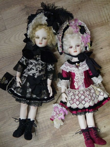 このサイズにはピンクやオフホワイト等の淡い色のドレスを着せることが多かったのですが、この子たちに似合う色を探した結果、黒とマゼンダになりました。