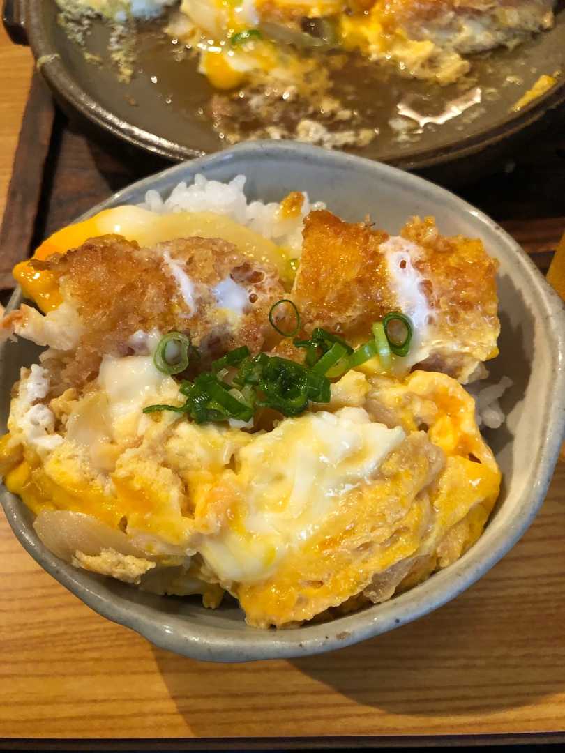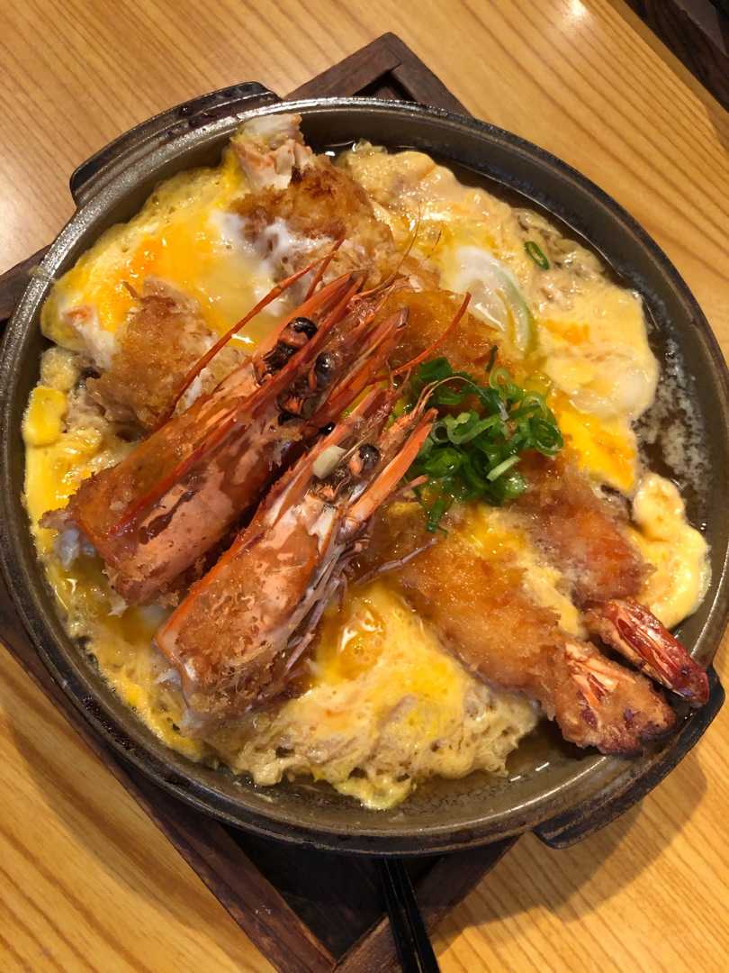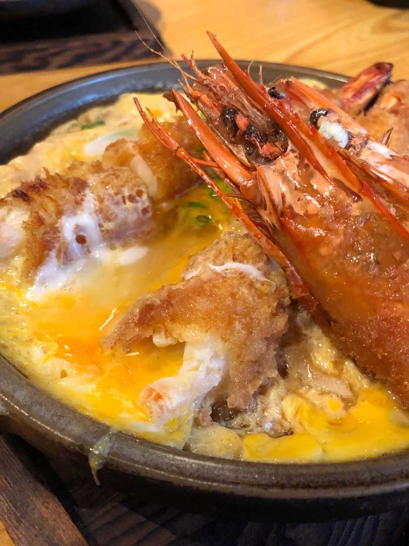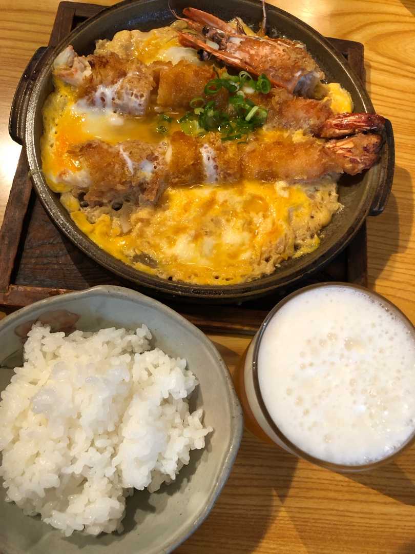 ふわとろの半熟卵が、固まってしまいそうで、ご飯の上に避難させて、海老かつ丼です。