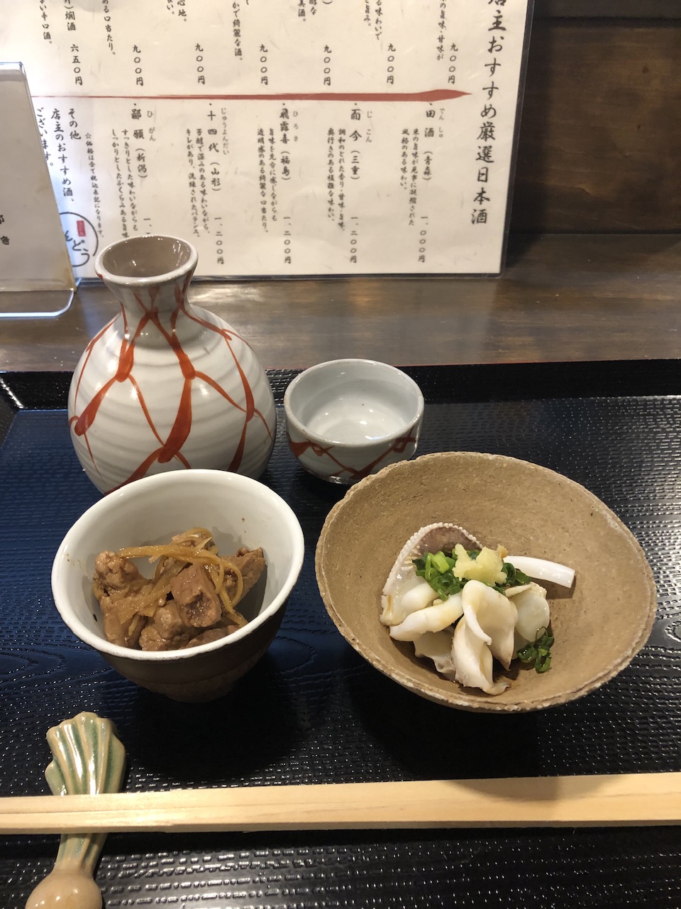 突き出しは牛肉の生姜煮とコウイカのゲソ