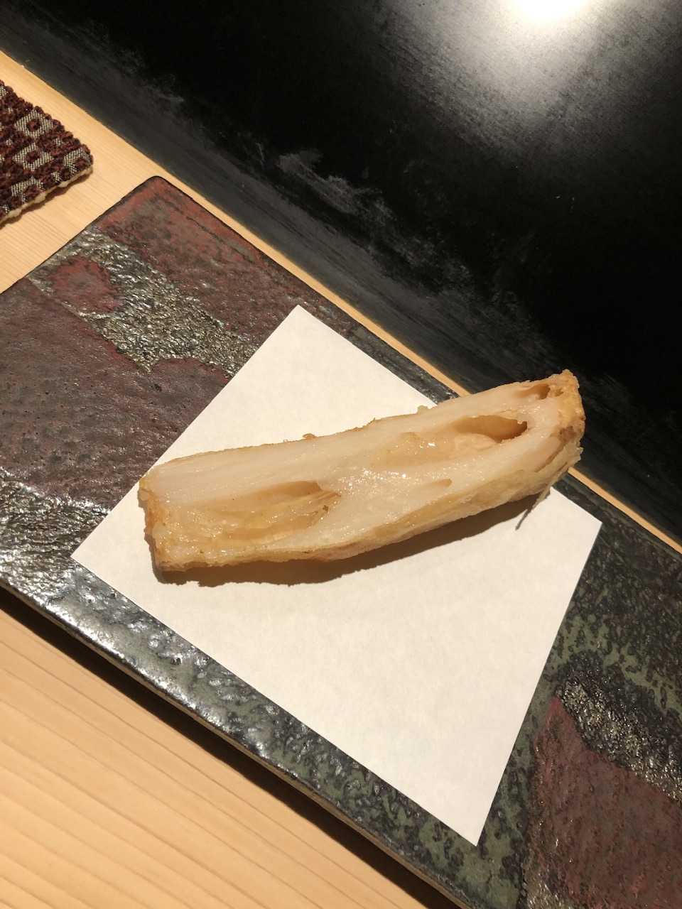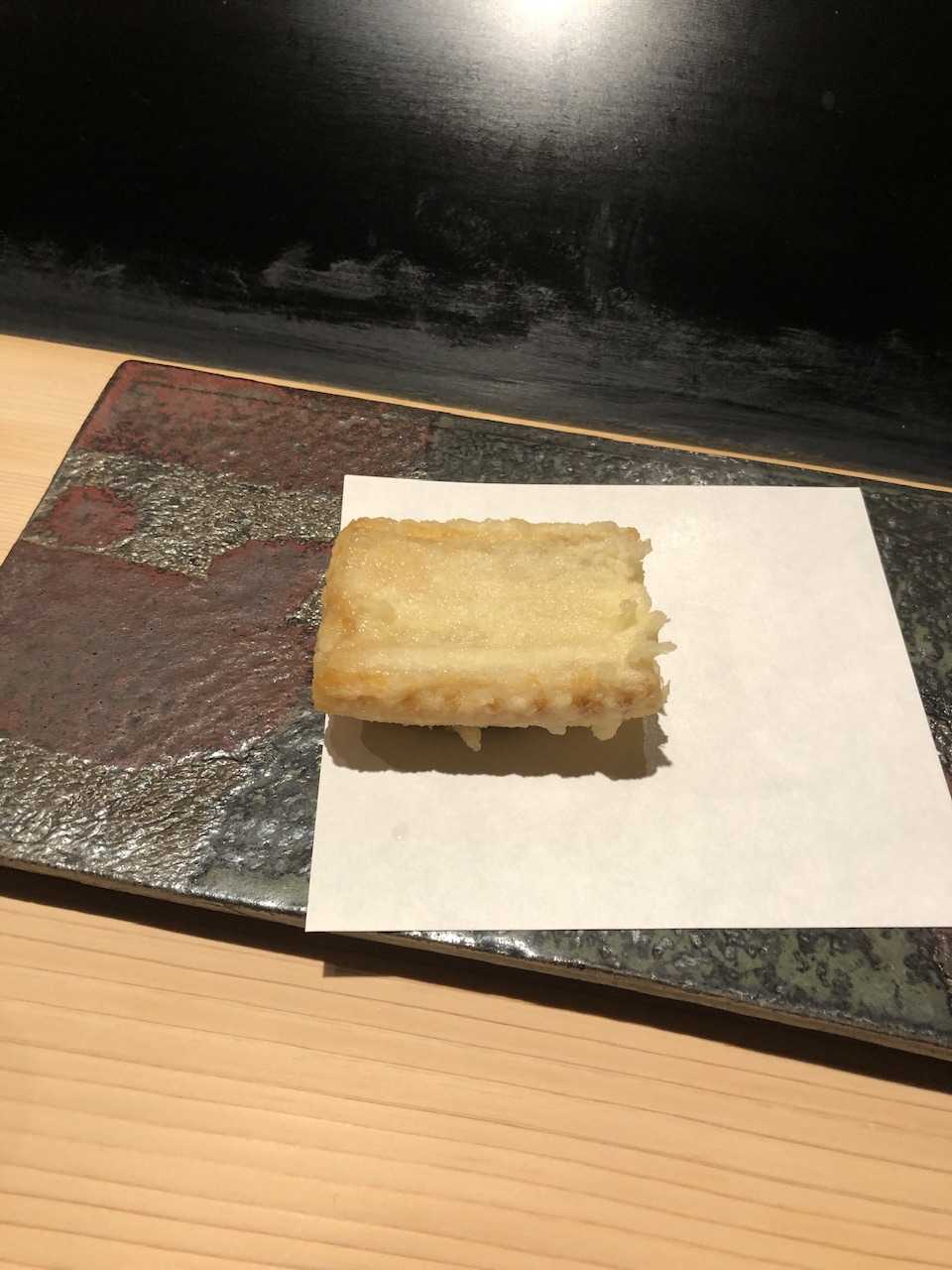 太刀魚、下側に大葉を貼り付けで揚げてあります。