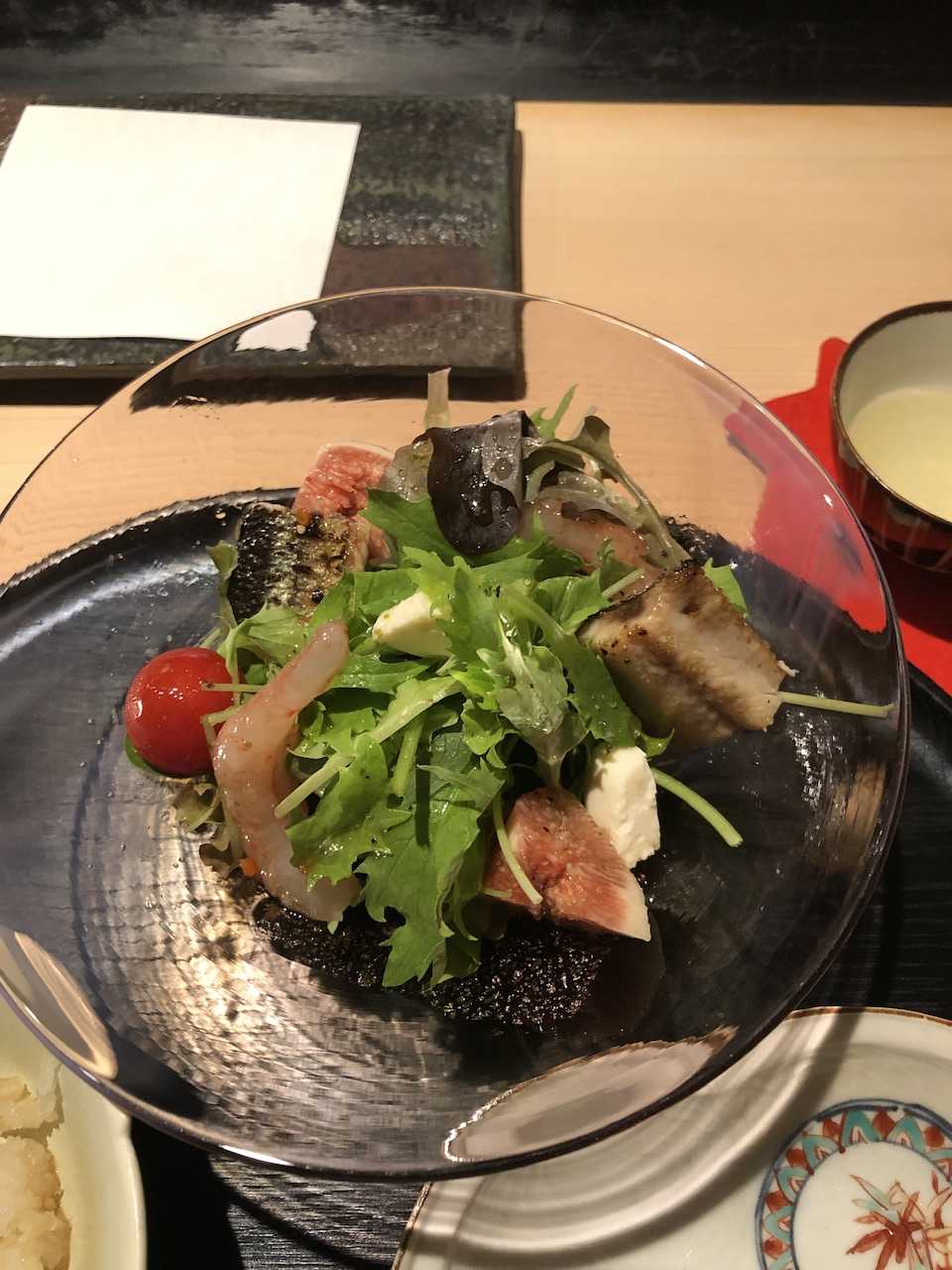立派な一皿、焼き魚と海老とイチジクとトマトがゴロゴロ入って食べきれないから、お隣のKZさんに半分以上食べてもらった。