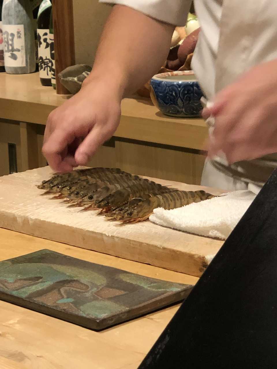 よく躾けてある車エビ、ご主人が水槽から出した時はバタバタしてたのに、まな板にのせたら嘴をぴくぴくさせながら並んでます。