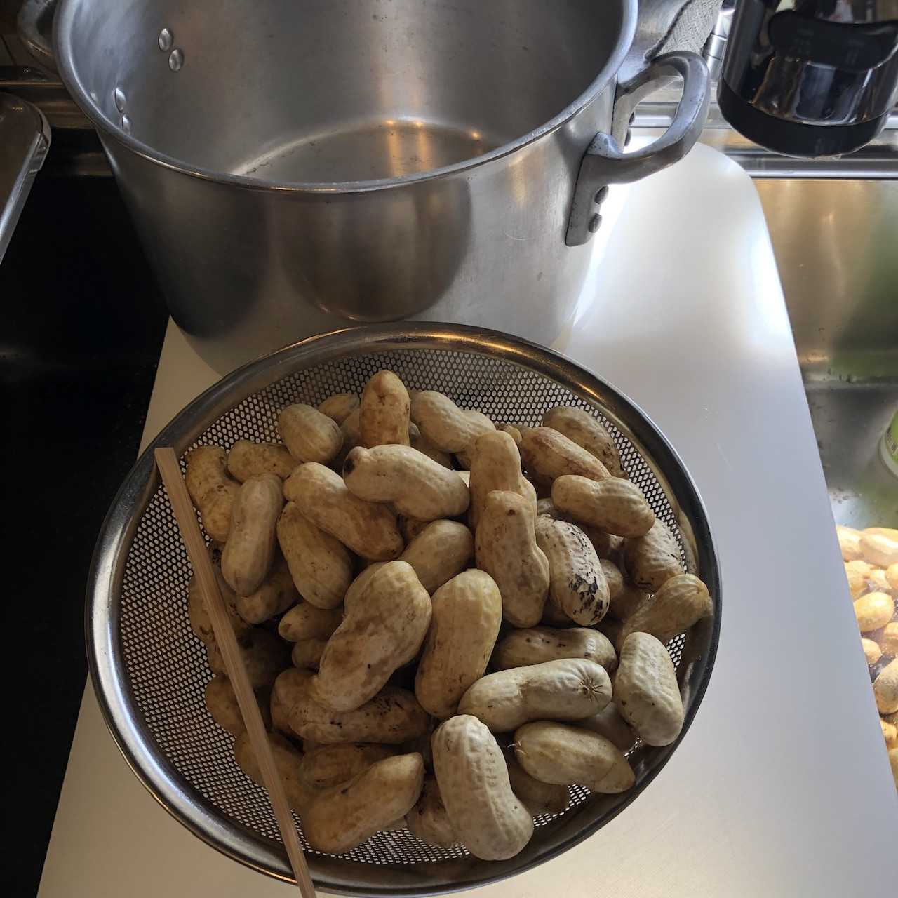 おじさん、乾燥した煎った落花生より、なま落花生のうでたのが好きです。毎年お取り寄せしている物の中に、なま落花生が有りました。だいたい八月にナカテユタカ、九月にオオマサリを2キロづつお取り寄せします。2キロを一度にうでるのに、大きなズンドウ鍋が必要です。まずは、ざるで土を洗い流してから鍋に入れます。箸の太さと比べると、大きさが判るでしょ?塩を50gくらい入れて茹でます。塩分濃度が濃いから、茹で卵作ったら塩味が染み込むか試してみました。強火で沸騰させてから、落し蓋をして中火にして30分。そのまま火を止めて、自然に温度が下がるにつれて塩水が殻に入るようにします。触れる温度に成ったら、ジップロックに入れて冷凍。勿論ゆでたてをおつまみに一杯やります。ほんのりぬくといのが最高に美味しいです。落花生のアクが鍋肌にこびり付きますから、しっかり洗って乾燥せて、今年のうで落花生の仕込みも終了。
