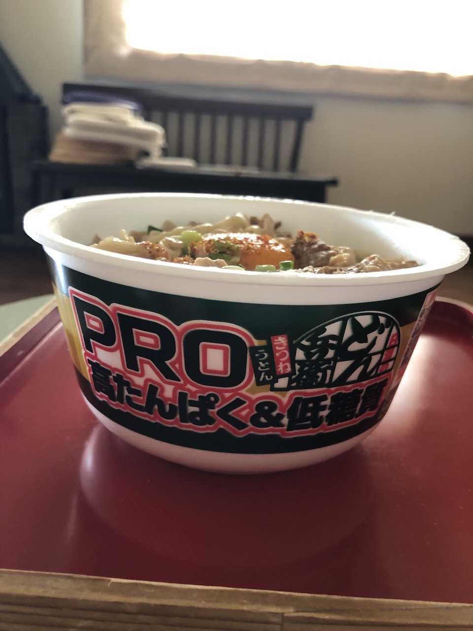 我が家で一番食べられるカップ麺、日清のどん兵衛PRO高たんぱく&低糖質きつねうどん。名前の通りなんで罪悪感なく食べられます。最近、お昼に外食するより、家でちゃっちゃと済ませて横になりたい。爺いですね。高たんぱくと謳われていますが、おじさんには足りないから卵追加は必須です。東新町のラーメンなるとやで貰ったチャーシュウの残りを入れて肉うどんにしてみました。たっぷりのネギを入れて、チャーシュウの味が染み込むよう良く煮込んでから麺を投入して作りました。もともとの、なるとやのチャーシュウが旨いからね。肉うどん旨し、また作ろう。どん兵衛PROの蕎麦も出して欲しいな。