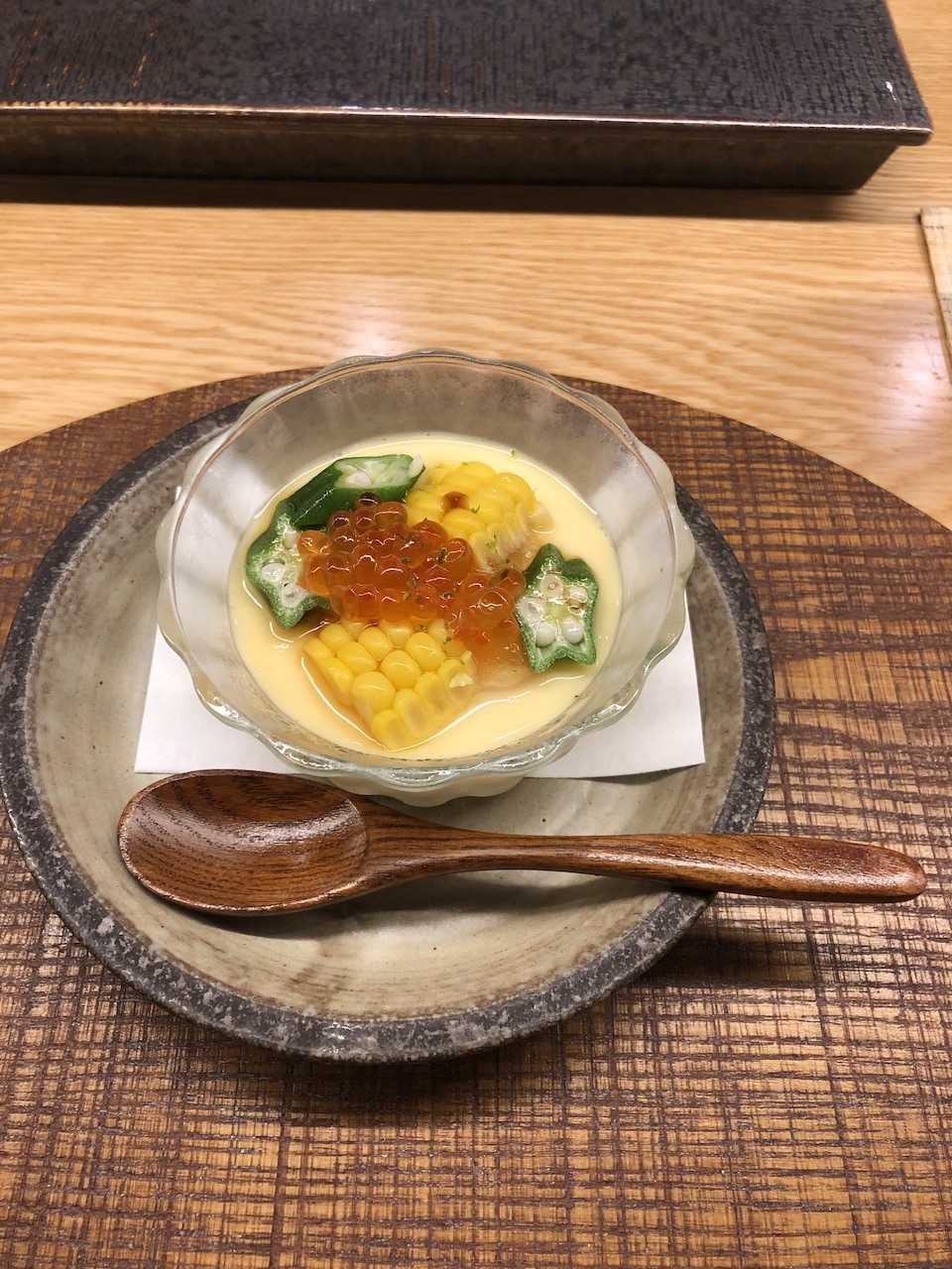 ロイマさんに誘われて。名古屋の繁華街、錦三でお値打ちに寿司が食べられる店。同伴したいおじさん達にはつおい味方ですね。スタートはガラスの器に、冷たい茶碗蒸し。上にトウモロコシの黄色、オクラの緑、イクラの赤が鮮やか。高級食材ではありませんが、眼に涼し気で良い絵です。脂の乘った秋刀魚の刺身、熱燗ください。モズクにケンサキイカ。これいいな~、家でも使える。サゴシの焼いたん。サゴシって言われたけど、鰆でも充分通る脂の乘りと大きさだと思うんですけど。カマスの炙りの握り、生のままより好きです。こういう包丁目を見ると職人さんって凄いな~って思います。帆立の握りって、久しぶりに食べました。三河はタイラギガイが多いから。海老はさっと湯引きが好きです。尻尾の殻を外してくれるのはとても親切だと思います。特に女性にはしてあげて欲しいよね。大きなコハダは、この細かい包丁目で酢飯に馴染むよね。赤身が一番。蛇腹の部分かな?新物か?・・・常連の方と一緒に行ってるからだとは思いますが、気さくな御主人で、カウンター越しに、いろいろなお話を聞かせてもらえました。一見のお寿司屋さんだけど緊張せずに食べられて良かったです。もう、錦三に行くことは滅多に無いから、なかなか裏を返しには行けないですが、ロイマさん、また誘ってください。