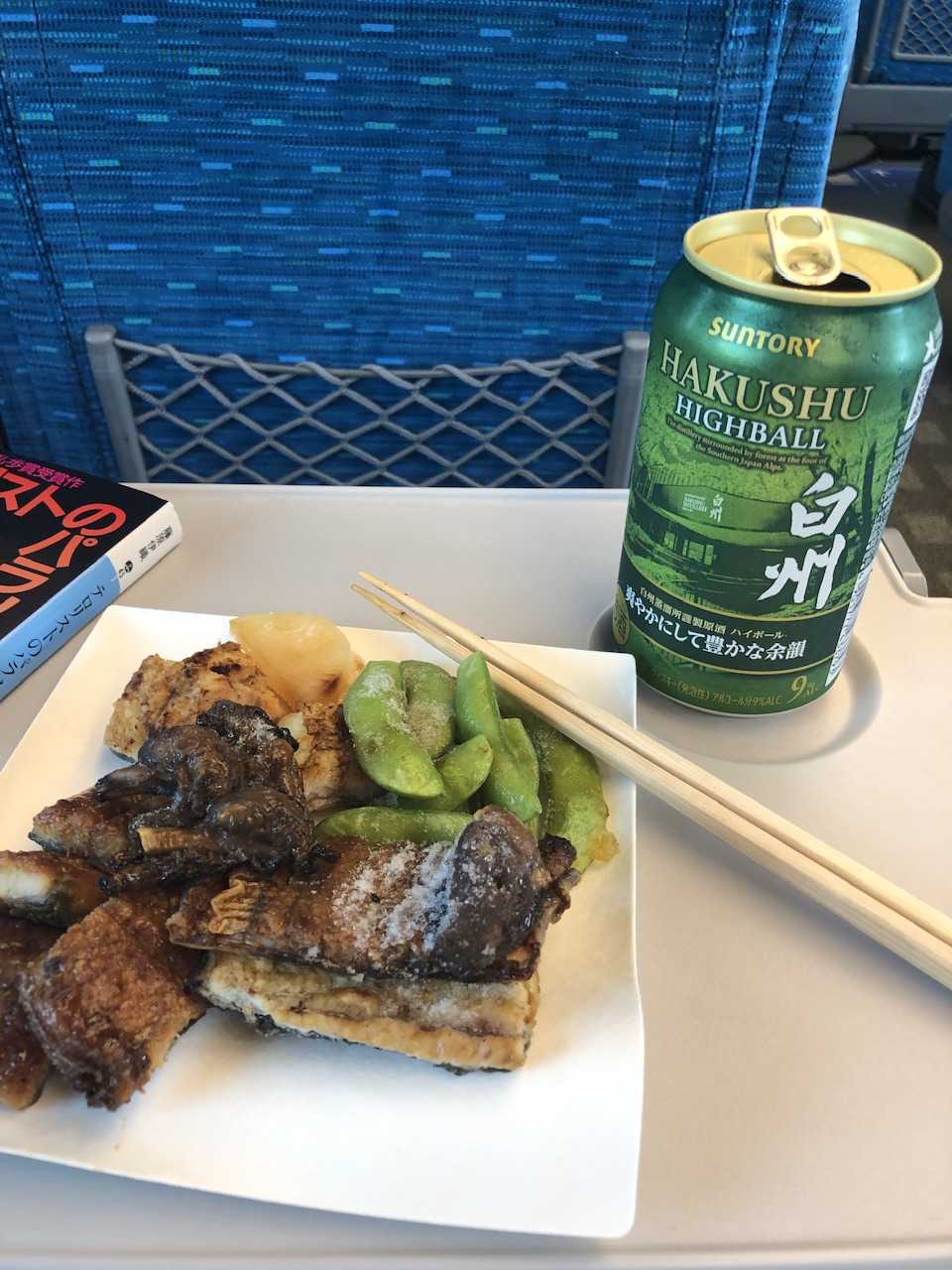 だいぶ、こだま号の一人飲みの練度が上がってきたぞ。今回も、三河安城から東京までこだま号で行きます。今回のメインディッシュは、西尾平井と一色兼光の鰻。それぞれのお店で食べ切れんかった鰻をお持ち帰りして、冷凍にしておいたもの。出かける寸前に冷凍庫から出してきたので、まだ、凍ってる(笑)これらが保冷材の役目もしてるから、冷べたいのは仕方ありません。時間はありますから、ゆっくり溶けるまで本でも読んでます。漬けもん、枝豆、肝焼きもあります。おしぼりも自前です。これで、テーブルを拭いて、皿も新しくして、第二弾はチーズと水割りにしよう。次回はシャンパンのハーフボトルとキャビアなんかもイイかな。でも、シャンパンとキャビアは自由席よりグリーン車だよね。帰り道は定番。東京駅、八重洲口改札を出てすぐ地下に降りるとある崎陽軒のシウマイバーで購入。これでお腹いっぱいだから、家に着いたら、「べらぼう」見て、風呂入って寝るだけです。