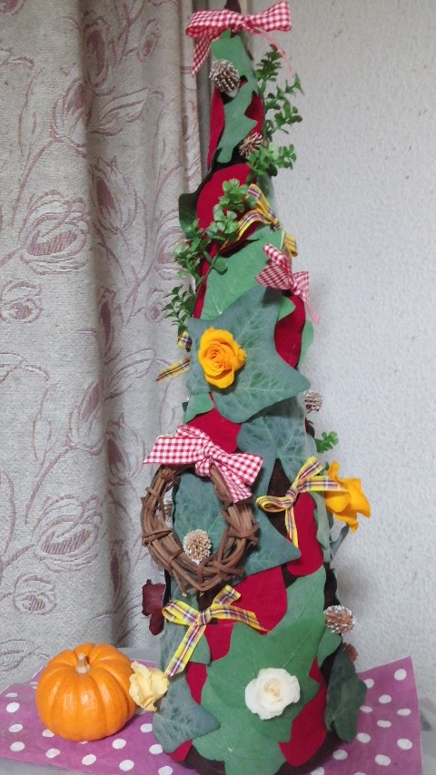と言っても、円錐形のコーンに、プリザーブドフラワーという特殊加工されたお花と、葉っぱ、リボンをポンドでぺたぺた貼り付けるだけ。もちろん、意外と手間は掛かるんだけど、お花のレッスンというより「図工」そのもの。なんか物足りないな~。クリスマスが近くなったら、もう少し小ぶりな生花ツリーでも作ってみようっと。