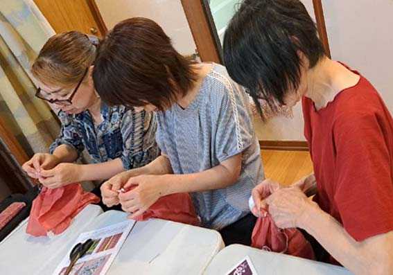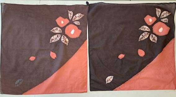 ウルシ染め絹ストール3名とツバキ模様木綿ハンカチ5名の手縫い絞り
