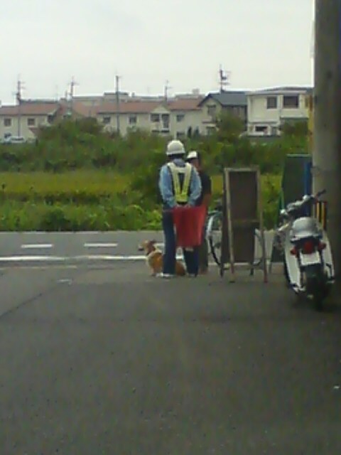 交通整理の警備員と犬一匹。近所のおじさんらしき人物。