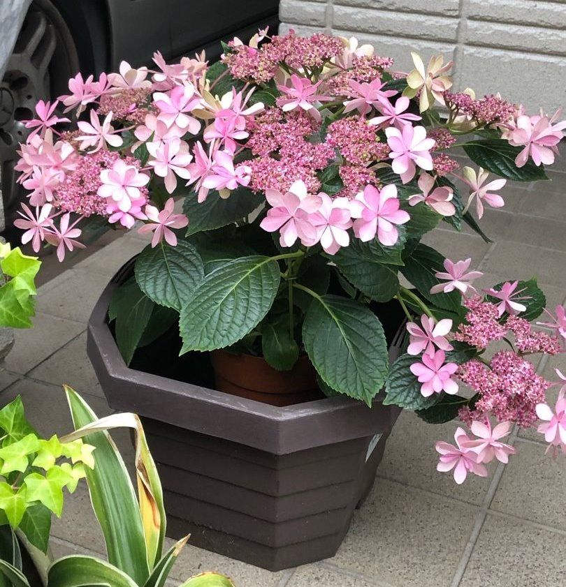 鉢植えのアジサイも咲き始めたわ(ガクアジサイ)