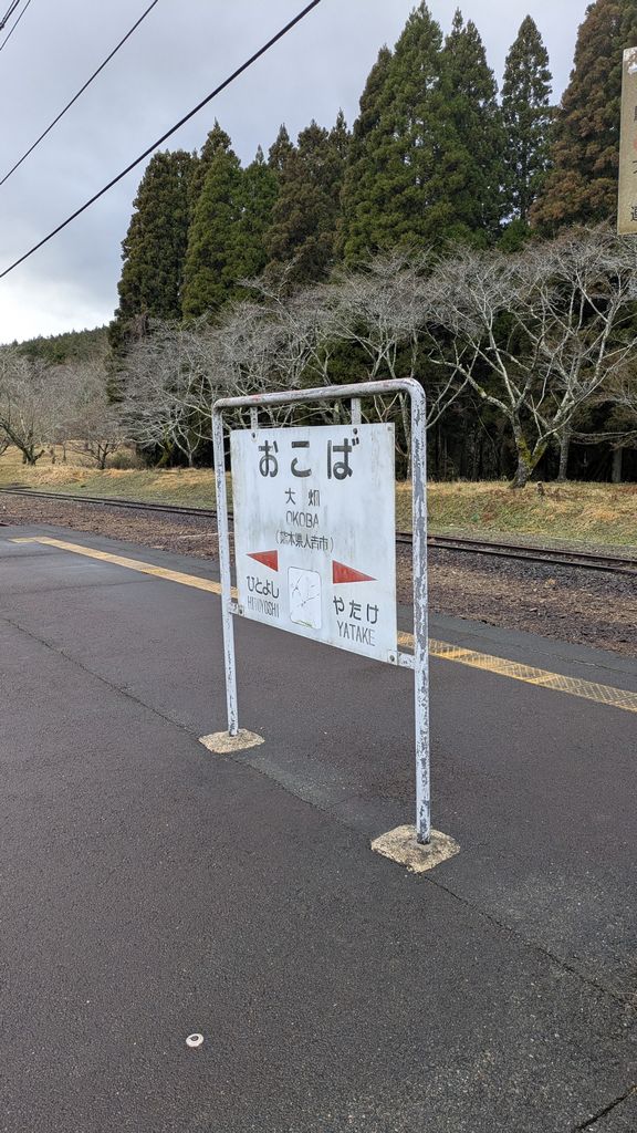 人吉梅園をひたすら上っていくと、「大畑駅この先」の看板があります。どうして峠の上に駅の看板が?