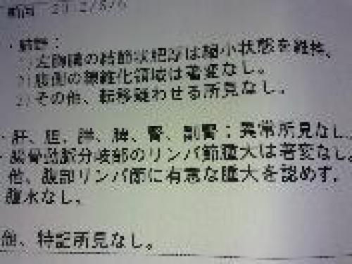 今日、吹雪の中を月イチでのがん病院受診に出かけ。 年末に撮った、肺~腹部のCTの結果も一緒に聞いてきた。 結果は、↓ 転移した左胸膜のがんは、抗がん剤・イレッサにより縮小したまま。 肝臓や腎臓などの臓器も異常はなく、リンパ節も前回撮影した半年前と変わりなし。 つまりこの半年間、悪化はしてなかったようだ…ということで一安心。 何か症状がでなければ、次はまた半年後の梅雨の頃にCTを撮るという話になりました。 いやぁー、これで半年無事生きられたということで、これからまた新たに半年生きていきます。( ̄ー ̄)ニヤ☆ ちなみに今日の採血でわかった腫瘍マーカーのひとつ・CEAも、正常値5以下のところ3.3と、先月とほぼ横ばい。 がんになる前は『横ばい』ってイコール『停滞』って感じであんまりいいイメージがなかったのだが。 "いかに『横ばい』状態を長持ちさせるか"というところが重要な今では、『横ばい』が素晴らしいことのように感じてます。(笑) 追伸:昨日の、「異動が決まった師長にどんなビールを贈ろうか」という悩みにレス下さった皆さん、ありがとうございました。m(_ _)m 「ヱ○ス」というお声を頂戴したんで、後は予算と、同僚で同じ発想でビールを贈ろうとしている人がいないかリサーチして、春にプレゼントしたいと思います。【AW】[サッポロ]ヱビスビールセット(715395/286)【楽ギフ_のし】【楽ギフ_のし宛書】価格:3,150円(税込、送料別) ↑検索してみて初めて知った。 ヱビ○って、サ○ポロビールの一種なんですか?? ずっと、"ヱ○スビール"って会社があるのかと思ってた。(汗)応援頂けるとありがたいです↓m(__)m