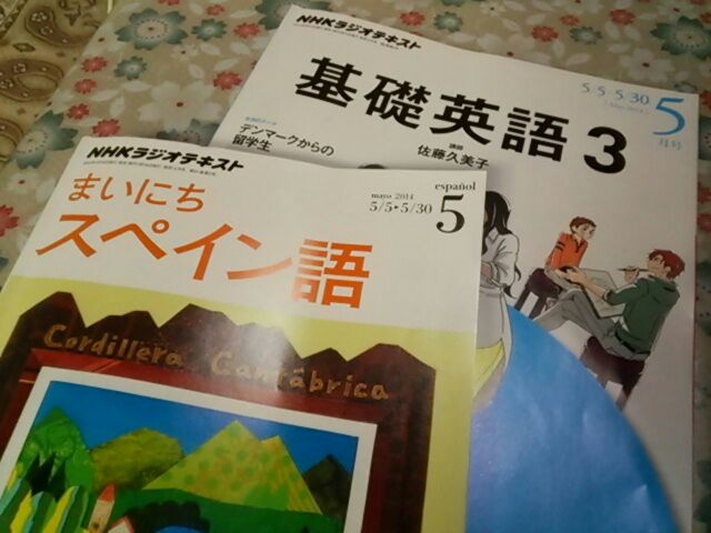 たまには「やってんだぞ」というところをブログにアップしておかないと、ウオーキングやお琴など、『3日坊主』暦がまた増えてしまうので。(汗…まぁお琴は、最近家に不幸があったということもあり、ご近所の手前まだおおっぴらには練習しにくい、という事情があるのだが^^;) NHKラジオの『まいにちスペイン語』&『基礎英語3』(スペイン語は超初心者向け、英語は中3向け)、今のところ1日1度は聞き続けているぞ~ぃ☆ とにかく1ヶ月続いた。 自分自身ほっとしている。(苦笑) しかし、そろそろマズいのが『基礎英語3』。 放送時間が朝6時半~45分、午後7時15分~30分、午後9時半~45分…と3回もあるというのに。 朝はちょうどダンナさんが起きてくる時間&私のテレビ体操の時間とかぶって聞けず。 夜の7時15分~は、7時のニュースを見ててつい忘れる。 そして9時半…断続的だが長きに渡る入院生活のせいか、9時過ぎれば就寝準備…という体内リズムが私にはインプットされており、つい寝落ち。。(~_~;) …って、「それじゃあいつ聞いてんの?」って言われても仕方ない状態!( ̄▽ ̄;) そこで思い切って、【楽天ブックスならいつでも送料無料】NHK ラジオ 基礎英語3 CD付き 2014年 05月号 [雑誌]価格:1,666円(税込、送料込) 見つけられなかったのでひとまず、CDつきテキストの画像を載せたが。 本当はスマホで音声ダウンロードができる…というのがあって、それを購入。 本放送を聞き忘れてしまったら、翌日時間のある時にスマホで聞く…ということで、どうにか1ヶ月続けられたのだ。(~_~;) 『まいにちスペイン語』のように、朝7時15分~30分&午後2時45分~3時…という、もし朝がゴミ捨てなどで忙しくても、おやつ時間にはまず聞けるというオクサマ向けの時間帯なら、聞き続けるのラクなんだけどなぁ~~。 時間帯も中学生さん向けの『基礎英語3』は多分、お金が続く限り…になりそうやね。(>_