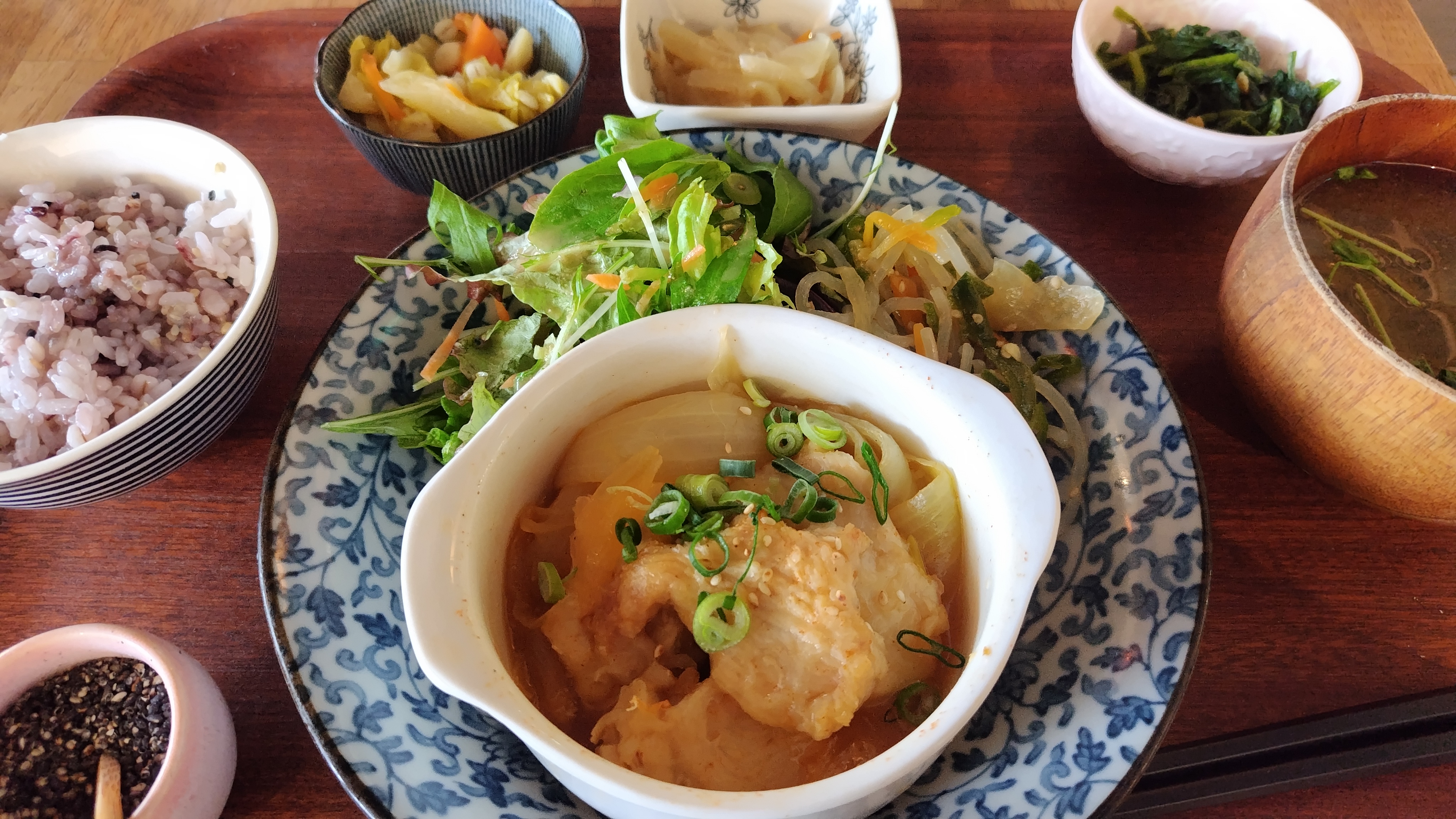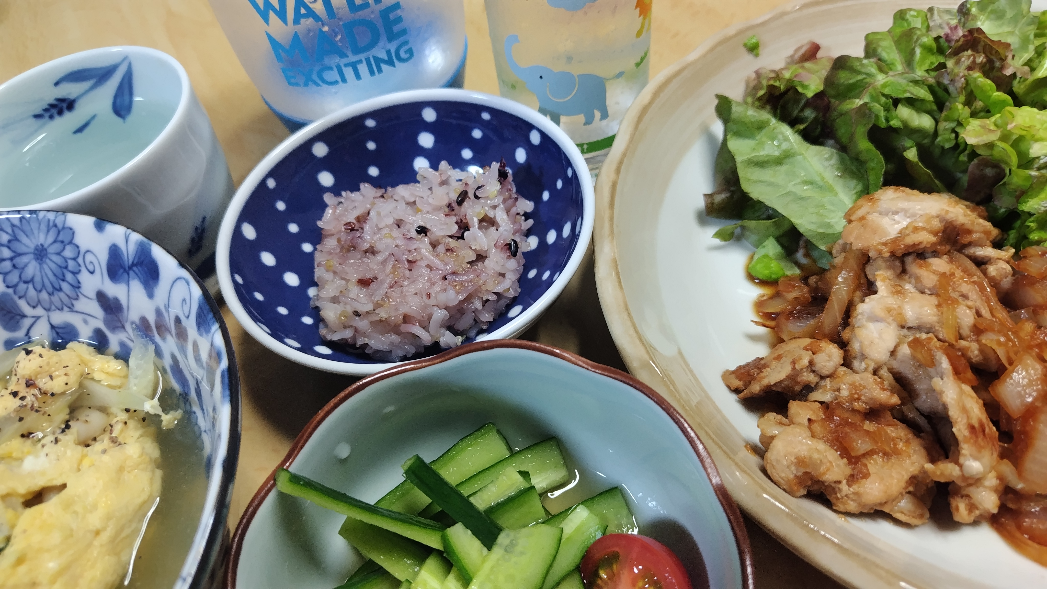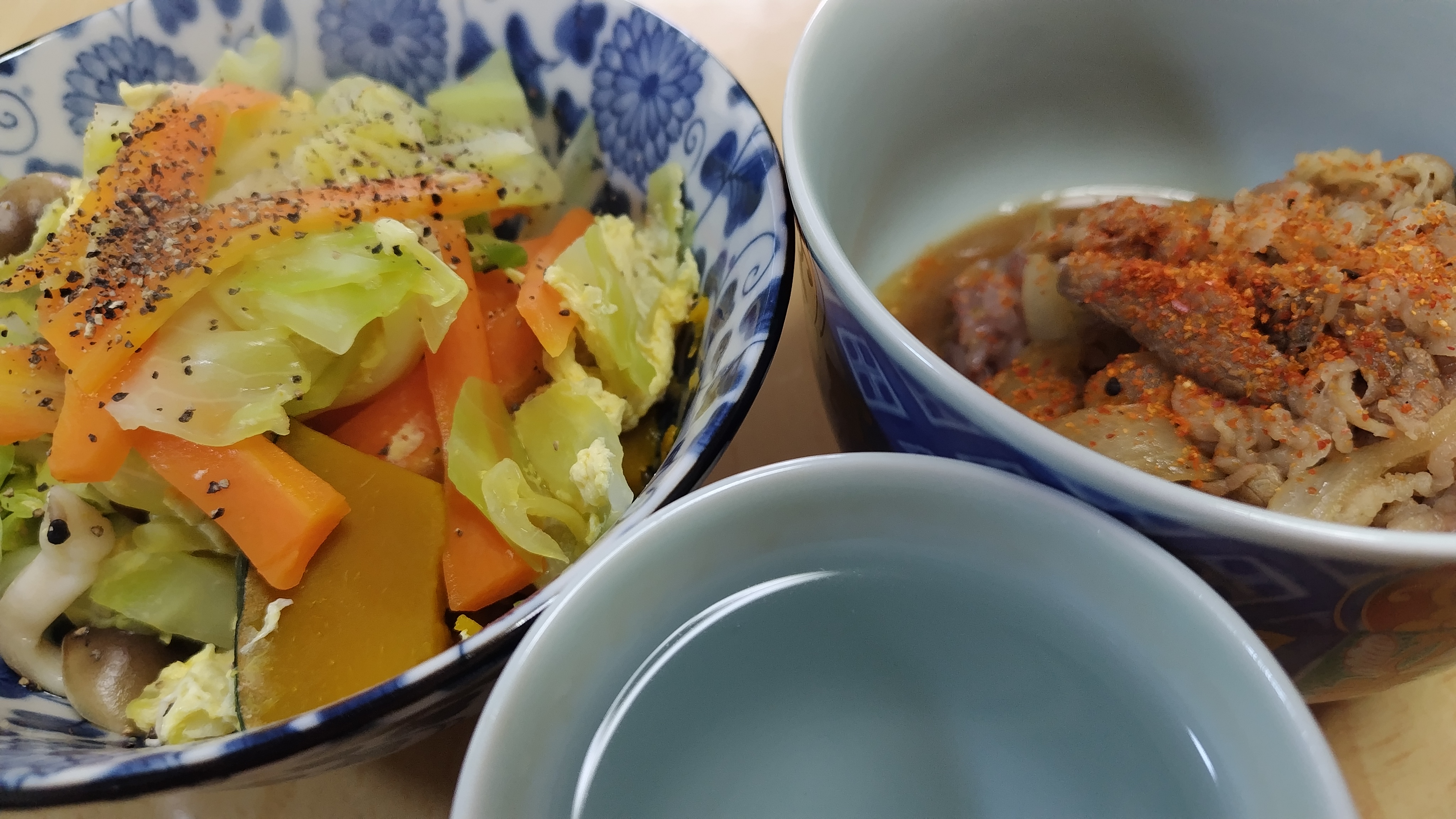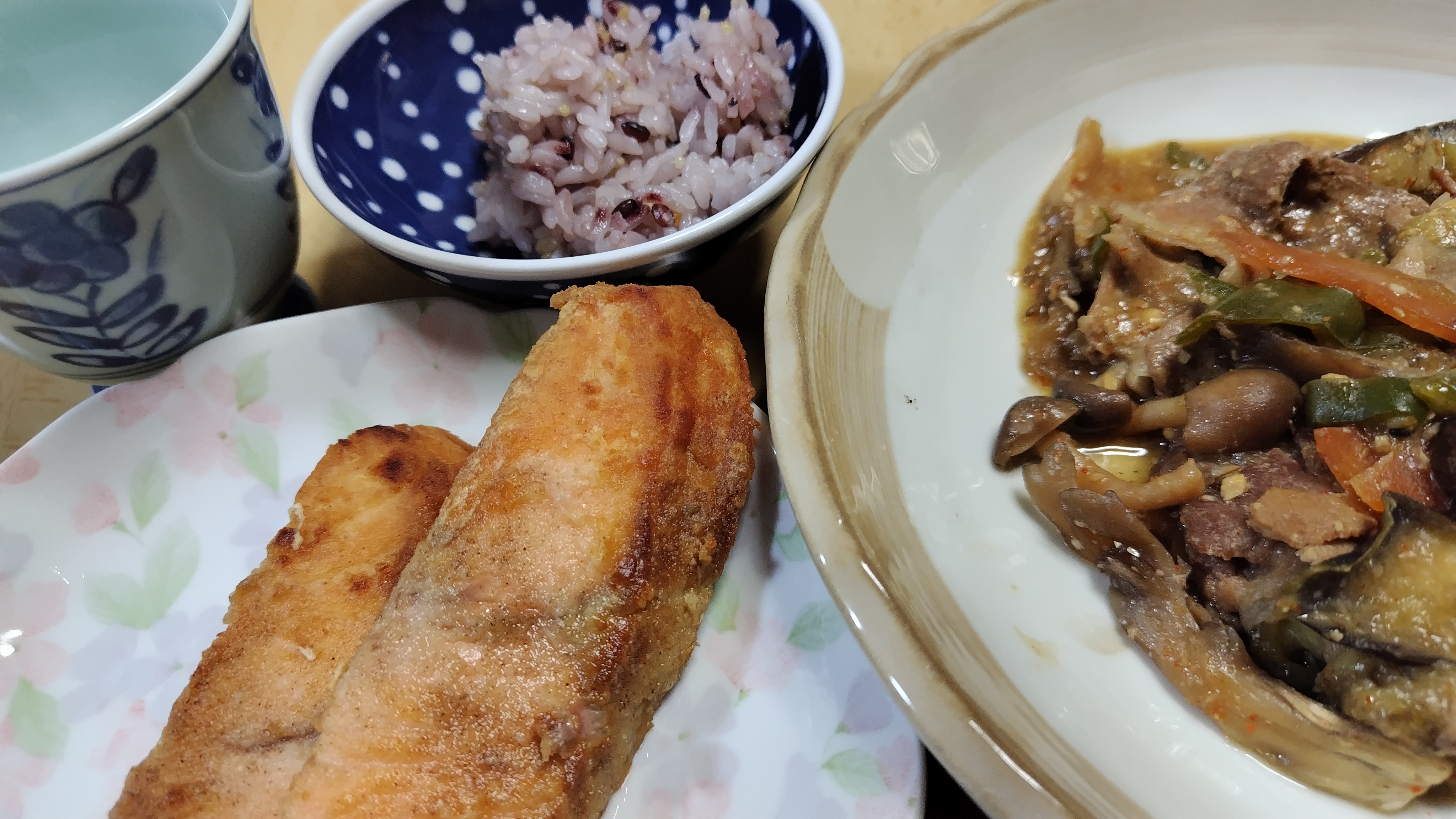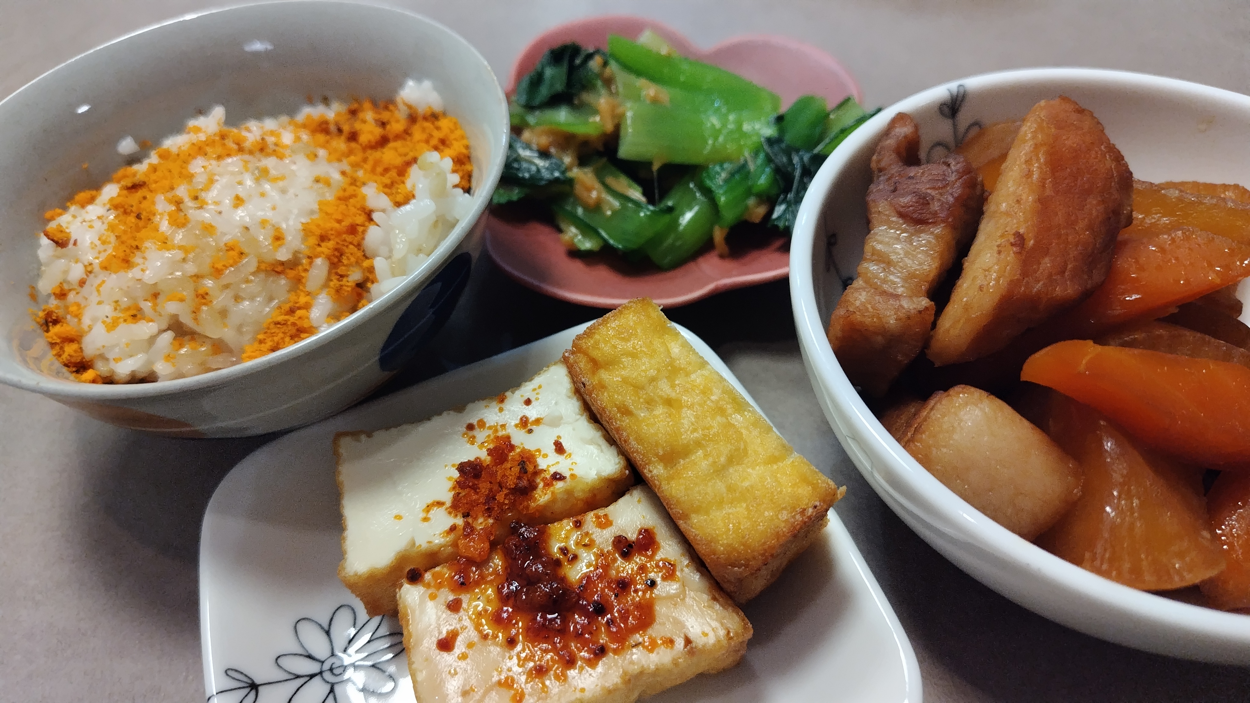 2025年4月2日(水) 晩ごはん豚バラと大根のべっこう煮焼き生揚げの粉ラー油だれ青菜のなめ茸あえご飯に粉ラー油だれをのせる煮物は圧力鍋で煮たらとても美味しいT-fal ティファール クックフォーミーエクスプレス 6L CY8521JP Cook4me