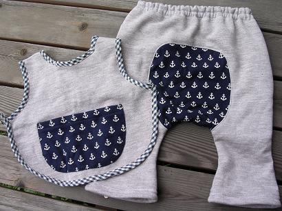 出産祝いを作って欲しい とオーダーをいただきました。エプロン型スタイとモンキーパンツです。おむつポーチもお付けしましょうか?とお伺いしましたが予算をお伺いしてからの製作だったので「あなたの手間賃が少なくなるからそこまでいいわよ」とおしゃっていただきました。…お気使いありがとうございます。最近とてもオーダーが増え「仕事」となってきました。大変ですがとても楽しく「仕事」してます。ブログにアップする前に梱包して発送することも多くあり「写真撮り忘れた~しまった!」って結構多いです。確かに手作りは大変です。家事を全て済ませ、6歳、3歳、3ヶ月の3人の子どもを寝かしつけてから真夜中に寝ないで作ります。3ヶ月の次男坊は夜泣きがあるので泣いたら中断して授乳やおむつ交換をします。理由もなく泣き続けるときももちろんあるのでスリングやおんぶヒモに次男坊をくくりつけオーダー品を作ります。ワタシの場合 一日のうち夜しか手作りタイムはないからしかたありません。やるときは午後10時から明け方5時くらい…もちろん徹夜もします。次男坊がお昼寝しているときは昼間もソーイングタイムです。ソーイングは大好きなので翌日 腰がミシミシ悲鳴を上げても平気。手作り服完成の達成感に勝るものはありません。今までたくさんの出産祝いのオーダーをいただきこの組み合わせは数え切れないくらい作りました。今回も細心の注意を払って丁寧に仕上げました。このエプロン型スタイ&モンキーパンツセットは出産祝いに大変喜ばれます。「ベビー服はたくさんもらうけどベビー服を卒業したときの服がない」と小さいお子さんのママさんから聞きます。このセットはヨチヨチ歩きをし始めた頃からかなりの期間着せることが出来ます。子どもだからクマさん、ねこちゃん、うさぎさん、わんちゃん…うーーんそれってかなりダサいです。子どもの幼い顔にこそシックな柄が映えます。マリン柄は定番柄でとてもおしゃれです。グレーの霜降りニット生地に紺のイカリ柄がかわいいと思っていますがいかがでしょうか?両方ともとてもしっかりした生地でガンガンに洗濯をしてもへたれません。安い既製服のモンキーパンツをお店で見かけ触りましたが泣けるほど薄かったです。おむつが透けてしまうのでは?というくらい。…そこまで薄くなかったか?言いすぎですねこんなにペラペラでしかも縫製技術が最悪。で、この値段??そのお店ではモンキーパンツが1500円でした。こんな品質でその値段はおかしいです。でも買っているママさんがたくさんいらっしゃいました。丈夫な生地できちんとした縫製なら1500円はお安いです。こんなペラペラのパンツをはく子がかわいそう…などとお店で悲しい気持ちになりました。そこまで色々想像してしまうなんて変ですね~~。エプロン型スタイはバイアスで布端を始末、腕が通るようになってます。ポケットは小さ過ぎるお子さんは使わないとは思いますがスタイのデザインとしてつけました。ポケット口には伸び止めテープをキッチリ付けました。見えないところにも処理をしないとあとで「やっぱりつければよかった」と後悔します。このセットで着せたらとってもおしゃれです男の子用だったので色目は「かっこよく」を意識しました。このセットを着てヨチヨチ歩きをするお子さんを見てみたいなぁ…。遠いところにお住まいなのでその姿を見るのは無理かな。うちの次男坊にも同じセットを作りました。ボロボロになるまで着て欲しいです。