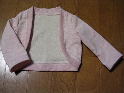 またニットボレロ作りました。グレーの霜降りニットで作ったらとっても気に入ってくれた娘。「こんどはピンクでくくってぇ~(作って)」「いいよ~ん」で、作ってあげました。もう娘は寝てしまったので床に置いてみました。ピンクの霜降り 裏起毛ニットです。かなり上質なニットです。以前 この生地でスカッツを作りました。リブもうんといいモノです。ベロベロ~ンとならないリブです。後ろはこんな感じ。コンパクトでいいでしょ~?かわいいねぇ後ろ身頃の首近くです。生地の色はこんな感じ。かわいいピンクですね。明日 このボレロとワンピを着てもらいたいな~