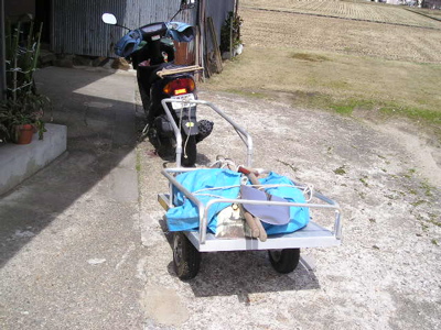 富山の福光で換気扇の取り付け場所の下見にいったお宅でこんな物を見た。ソコのおばあちゃんの畑行き用特別牽引車である。大変おしゃれで、思わず写真に撮ってしまった。