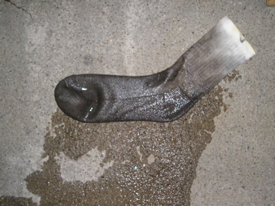 雨水タンクにかなりの黒いススのような物を取るにはドウしたら良いか、イロイロ考えていたのだが、有るときふと思いついた。ゴムののびた白い靴下である。これを雨水を導いている雨といに履かせれば、フィルターに成るのではないか。其れを実験開始して丁度ひと月。普通の靴下が、冬の分厚い靴下に変化しているではないか。コレは上出来である。そして2枚目に交換した。