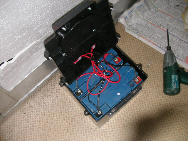 中に20Aのバッテリーが二つ入ってます。テスターで計ってみると奥が13,22Vで手前が12,04Vです。あとの二つは13,4Vと13,34Vです。手前の12,04を何とかすればスピードが上がるはずです。