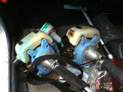 草刈機を欲しいというので、長期在庫の二台を動かそうと試みました。ガソリンを入れて、プラグは火花が付いてるし。しかしかかりそうでかからない。しばらくしてから、キャブクリーナーを探したが見つからないので買ってきて二吹きすると難なくかかってしまいました。本当にあっけなくかかりました。数年前に何回かやってみたけどかからなかったのはなぜだろう。とにかく、二台で手付金3000円、残金5000円、合計8000円で売れました。めでたしめでたし。