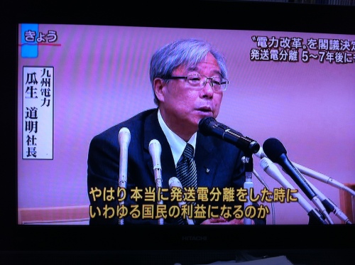 今までわれわれ電力会社が独占して、好き勝手に儲けてきたものをなぜ今更他人にも分けてやらなければいかんのだ。誠に理不尽である。もっともっと設けさせてくれなければ嫌だ。また外国では発電、送電分離は既に普通であっても、我が国は独自にガラパゴス電力会社としていきたいのだ。というふうに通訳できました。