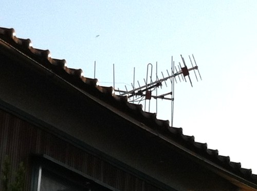 ご近所から通報があったらしいのです。我々からすればステンレスの針金が付いてるのでまず落ちては来ないのですがね。上からKさんがアンテナを降ろします。私がロープを引っ張って二階のガラス窓にぶつからないようにします。二人の阿吽の呼吸が必要ですね。どうして写真を撮っているかというと、片手でロープを操りながらもう片手でアイフォンで撮ってるのですよ。名人技?