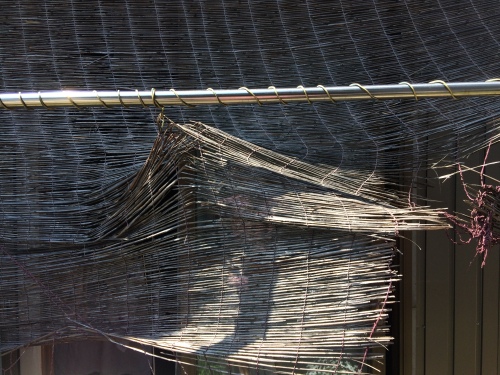 かねてよりうちの王女様の王命で簾を新調せよとの仰せをやっと実現できました。最初はオーダーの高級品でしたが、今は二枚で1000円ちょっと。草履も鼻緒が切れたので廃棄。