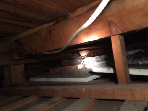 去る9月20日に洗濯場からスズメバチが5匹見つかって娘が大騒ぎしてたのでした。早速換気扇?取り付け跡を念のために封鎖。その後近所に聞き込み調査をしましたがスズメバチの巣は分からなかったのですが、やっと判明しました。一応殺虫剤をかけましたがもうもぬけの殻のようでした。