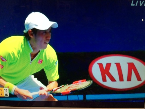 ロレックス ラコステ IBM ジェイコブズクリーク(ワイン) ANZ(オーストラリア ニュージーランド銀行)等が見えるが、何しろKIAがいっぱい。ネットの左右、後ろに12個、左右にもたくさんある。幾らコマーシャル料を支払ったのだ。KIAは韓国第二位の自動車メーカーであり、今は現代自動車の傘下である。少し前までは後開発国の車事情は日本の文字の付いた中古車が一般的だったが、このところKIAの新車がちらほら見える。その上これほどコマーシャルにお金を使っていれば、われわれ日本人が考える以上に世界では売れていると思われる。錦織が来ているのがユニクロ。コマーシャルの効果は凄いものである。