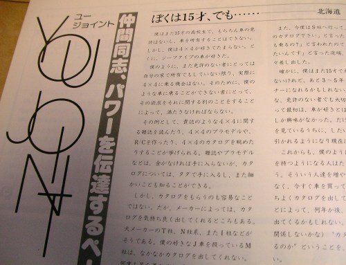 北海道 15歳の高校生がカタログを貰いに行って苦労した話が書いてありました。そう言えば私もその頃クルマが大変好きでカタログ集めをしていました。今でも覚えているのはトヨタのセンチュリーのカタログが貰えなかったことです。その時に丁度筆者と同じようなことを思いました。免許をとっても、絶対にトヨタは買ってやるものかって。本文は割愛しますが、編集者の温かい文を紹介します。T社とか、暗号は使わないで、トヨタ、日産、いすゞ、ジープ、三菱とキチンと書いてください。君の主張は正しいのですから。遠慮も同情もいりません。それが本当の親切です。又、女性に対して ブス などという類の言葉を使わないようにしましょう。使う人の心を貧しくしますから、結局使った本人が損をします。このお姉さんだって、もし君がもう少し年がいっていて、美男で、足が長ければカタログはおろか、車そのものだってプレゼントしてくれたかもしれませんよ。4✕4マガジン1983年3月号より。私はこの本をオークションで落札し、仙台から送ってもらい、一冊ずつ出品していました。普通はほとんど読まないのですが、チラホラと読んでみました。ふとこの記事に目が行ったのでした。以前ネットで私と同姓同名を調べてみました。またFACE BOOK などにも幾つか出てきました。一度同姓同名の方にお会いして見たいと思っていて、福井の人にあって欲しいと言いましたら断られたようです。早速この記事の方を検索してみました。北海道でお一人出てきました。そこでやめておけばよかったのですが、思い切って電話をしてみました。奥様らしき方が出てこられました。金沢のぬかしんぼと申します、こうこう言う訳でと拙い説明をしましたがきっと怪訝に思われたことでしょう。無理もありません。おれおれ詐欺やらいろんなことがありますからね。その後暫くしてご本人から電話がありました。お仕事中だったので早々に電話を切ったのですが、銀線名人と検索してこのブログを見て下さいと言いました。果たしてこの方は特にもらうのが難しかったジープに乗っておられるとのことでした。商売とは何十年も先をも見据えて子供であっても将来のお客さんだと思い大切にしてほしいものだと思います。又この方とお会いできたら幸せです。このジープに銀線名人を取り付けて欲しいと読んでくれたらなお嬉しいですね。