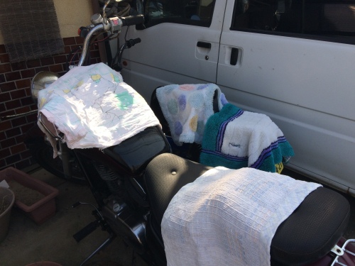 バルカン800もTOMOS3もこのように役に立ってます。トイレマットと台所マットを干すのに最適です。物干し竿ではこんなにうまく干せないのです。コレは昨日のことですがTOMOSの走行距離は気にしてはダメです。TOMOSお約束のメータワイアーが即切れるので殆どのTOMOSはメーターは動いてない。ということは走行距離が非常に少ない。せいぜい1000キロとか2000キロ、しかし全く当てにはできないけれども、毎日のように乗ってる人もきっと少ないのだろう。私のキャンピングカーのようにほとんど放置プレイのようだ。車庫に入ってないTOMOSは即錆びる、錆びたら嫌になる、そのまま数年放置、そのうちじゃまになる。お陰で私のところに来る。ありがたいことです。今の処TOMOS三兄弟は関東勢のみ。さてさて昨日、絶対にタンクづまりだと踏んだので・・・かなりスッタモンダで、TOMOSは整備性が悪いのでね~満タンに入れたタンクからガソリンを抜きまして、ガソリンコックを外してみましたが、ウソのように著しく綺麗なのです。詰まっていて欲しかった。TOMOS はフレームがタンクなので結構詰まりは多いのです。仕方なく次はキャブです。エンジンを吊るしてるボルトを三本抜きます。おっと、プラグコードでエンジンを支えてます。切れたらまずいが、意外と丈夫、マフラーも外さないとエンジンが降りない。段々下手になってます。腕は落ちますね~昔とった杵柄なんて、屁の突っ張りにもなりゃしね~キャブも綺麗、残念!!汚く有って欲しかった。予備のキャブとあと二台のドナー?があるが、あまりに綺麗なのでキャブクリーナーで吹いて取り付けてみる。ついでにフロントブレーキの効きが悪いのでオーバーホール。コレも十分にパッドもある。ペーパーで研いてオシマイ。しかし効きはよくない、私の腕が下手なのか?それともTOMOSは性能が悪いのか?テスト走行するも、残念ながらくたびれ損でありました。明日はキャブの交換、あと三個あります。少しストレスが溜まってます。