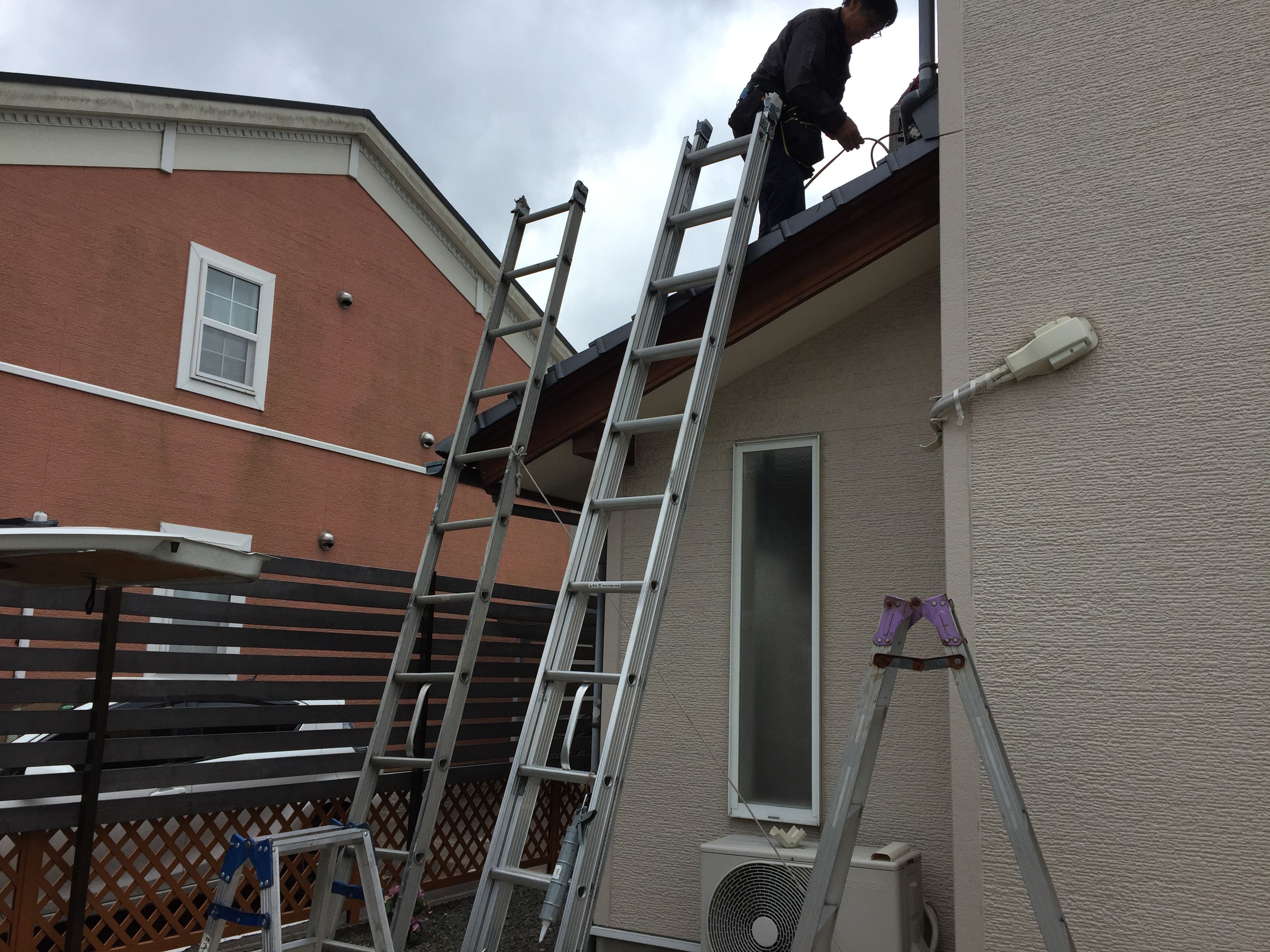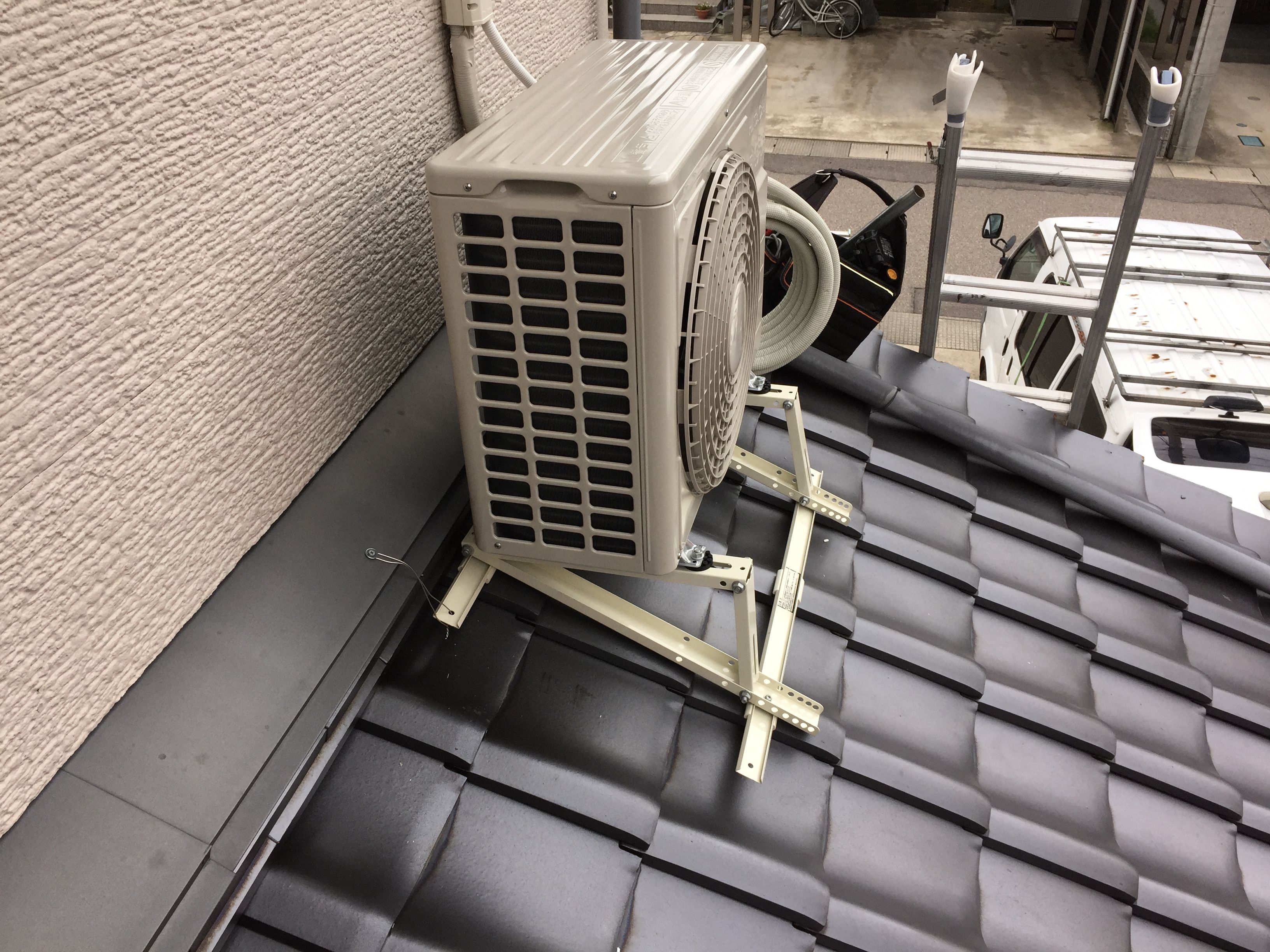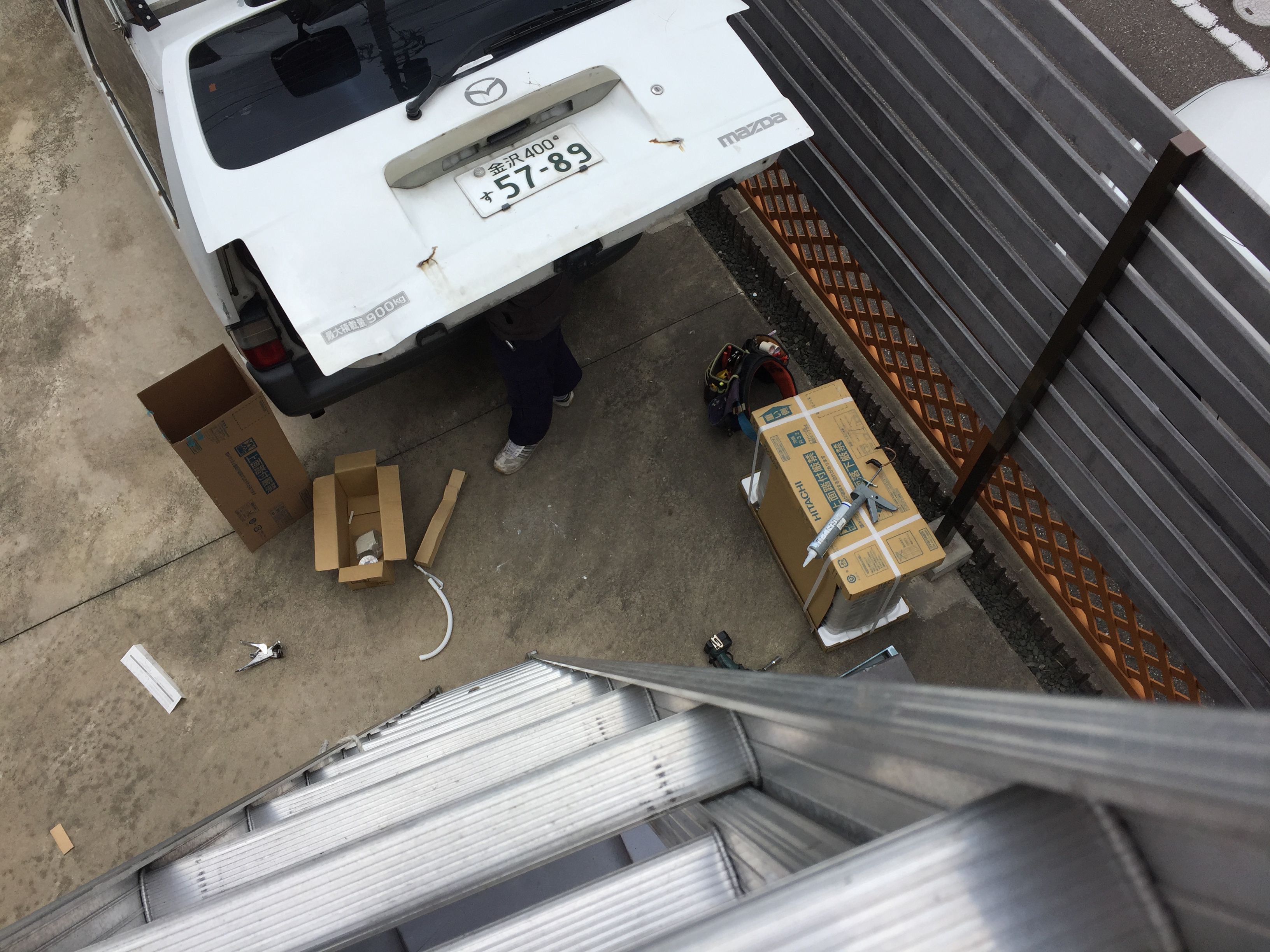 残念ながら、二階の窓からは出ることは出来ませんので室外機はハシゴで挙げねばなりません。