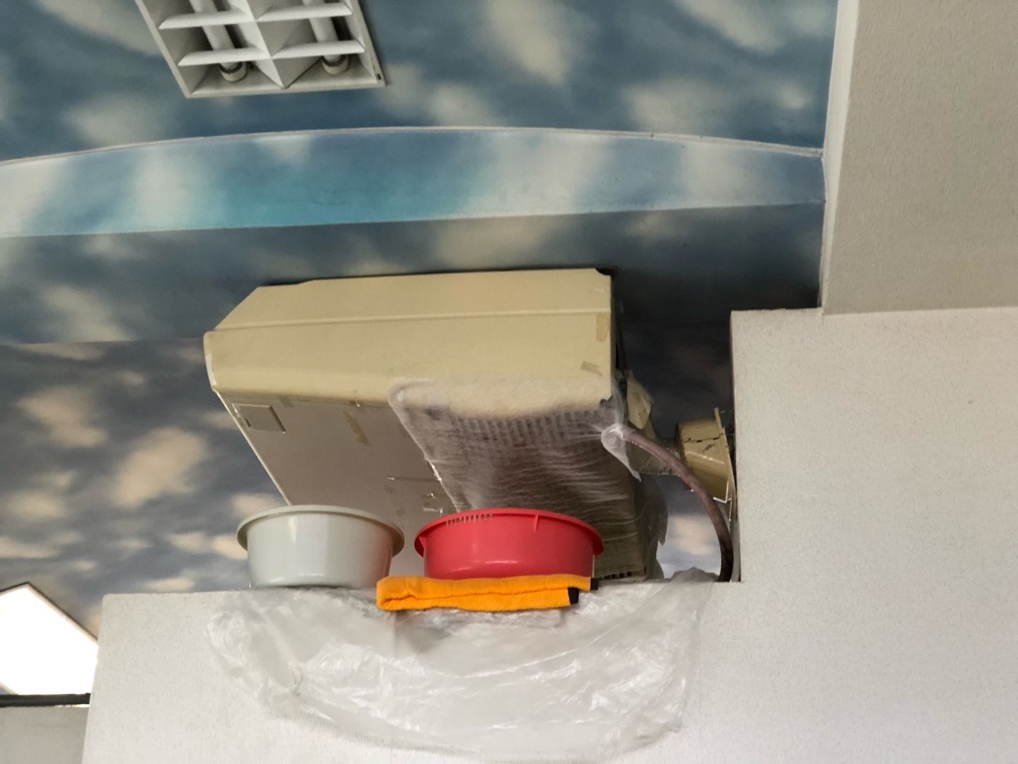 閉店と言う目で見ると エアコンも水漏れで洗面器二つで受けてますのでどうぞご容赦を って聞こえてきました。