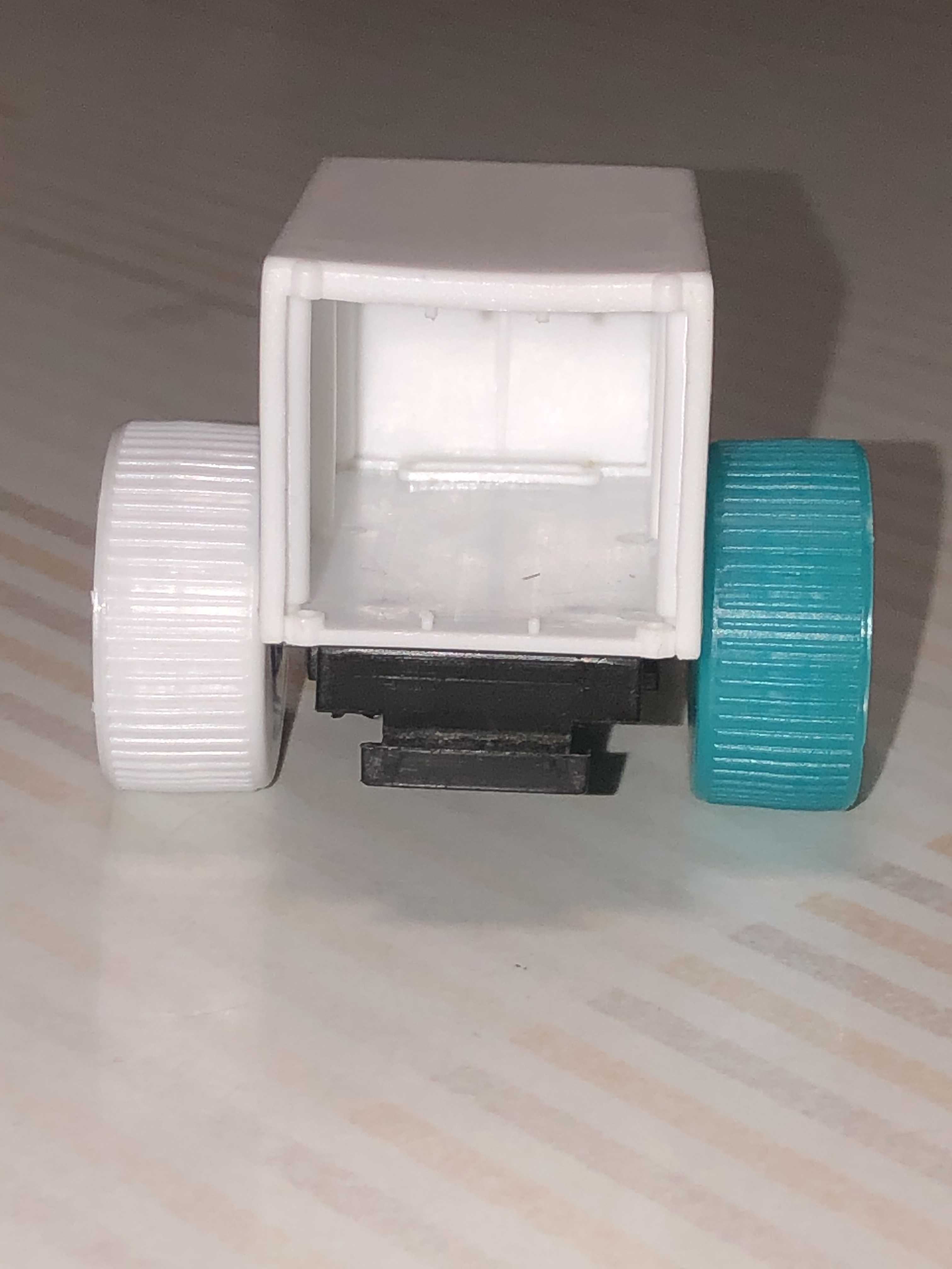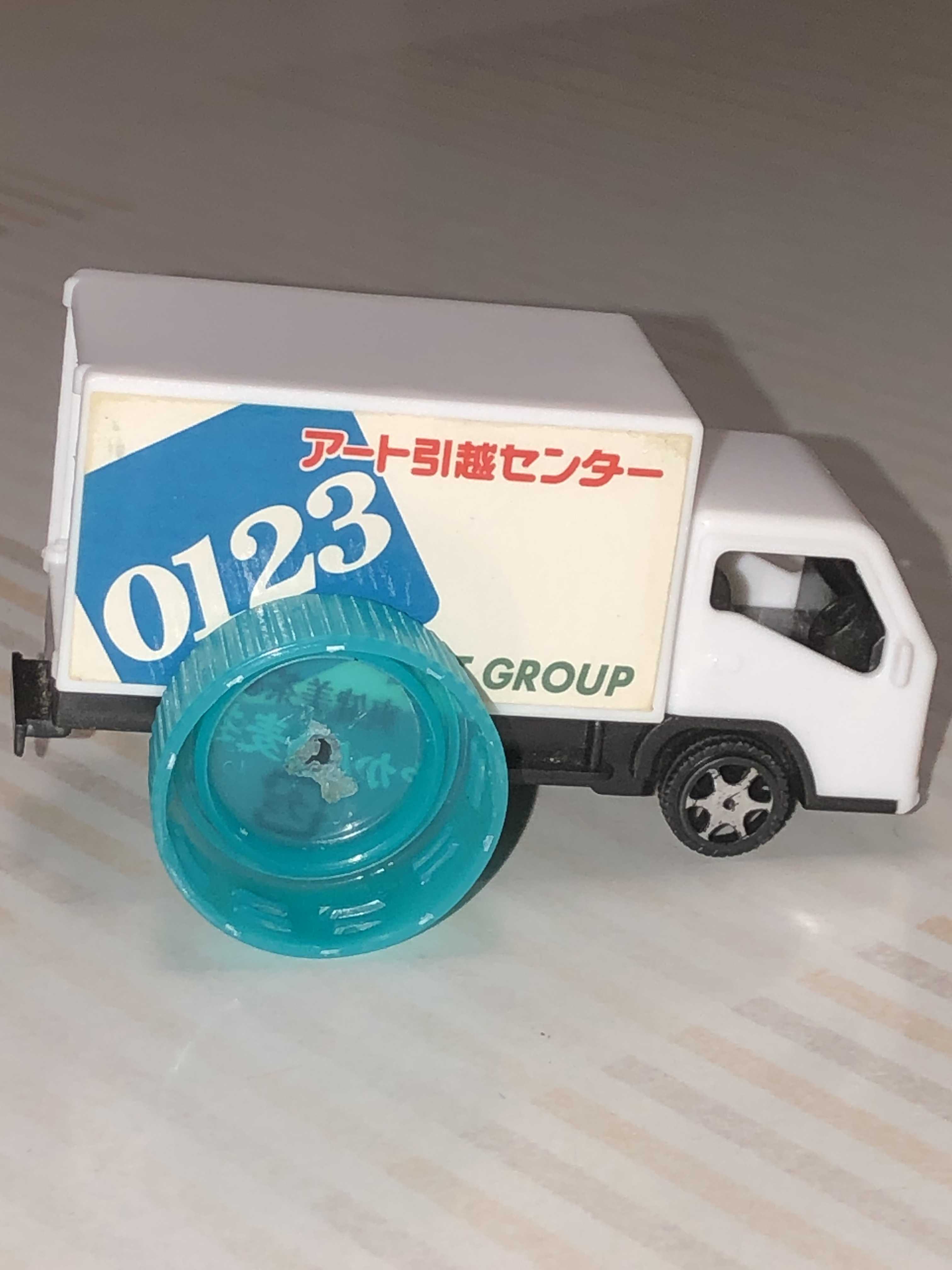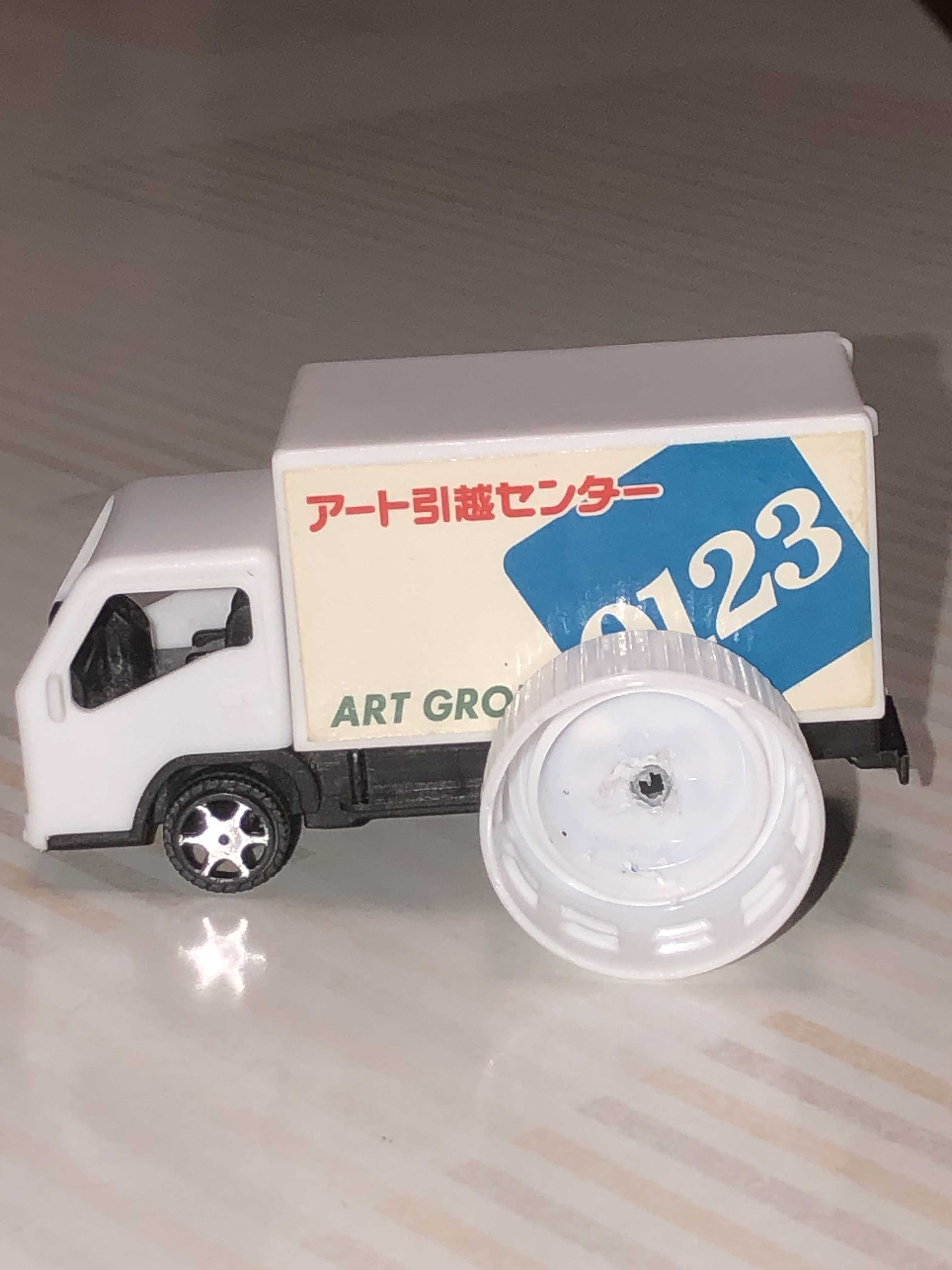 本体には後軸のためのちょうどいい太さの穴を開け、後軸はストローで、後輪タイヤ(ペットボトルのキャップ)と後軸をお得意のプラスチック溶接でくっつけた。