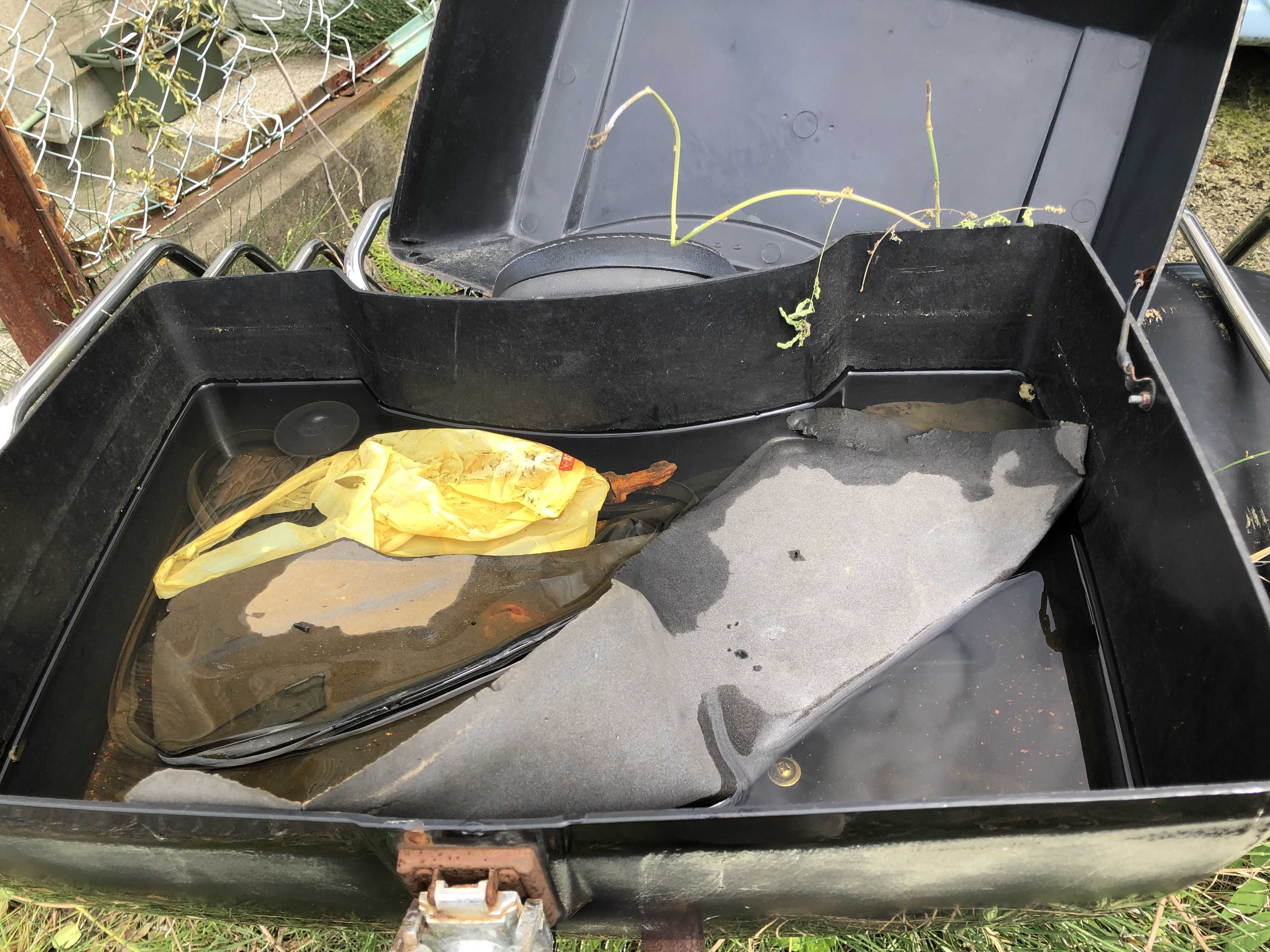 今流行りの室外機泥棒に間違えられないか少し心配してました。往復3、76キロを20分ちょいでゆっくり走りました。途中お買い物もしてそれは背中に担ぎました。中国製の三輪バイクの荷物置き場に雨が溜まっていたので穴を四ヶ所開けて排水完了!!どうも詐欺電話のようです?この赤いのは神戸のヨットハーバーでヨットの 船底を赤い塗料( 貝などがくっつかないような毒を含んだ塗料を)塗った時のものです。