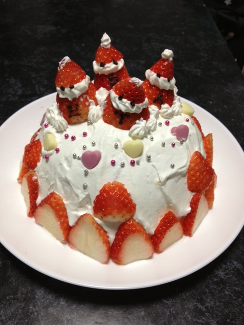 Merry Christmas!我が家のクリスマスケーキは、これ!娘の手作りです。よ~~~~く見ると、家族それぞれのイニシャルがサンタの顔に書かれています。ドームの中は、苺のムースとみかんのムースが入っています。