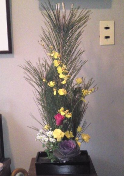 大晦日ですね。やっと落ち着き、お正月のお花を自己流で生けました。松は、Monica先生からの頂き物です。色花の合計金額は、398円。関西人のヌクヌクですから、安く仕上げたっていうのが・・・自慢なんです。黄色を基調にした、金運アップ祈願生け花です。