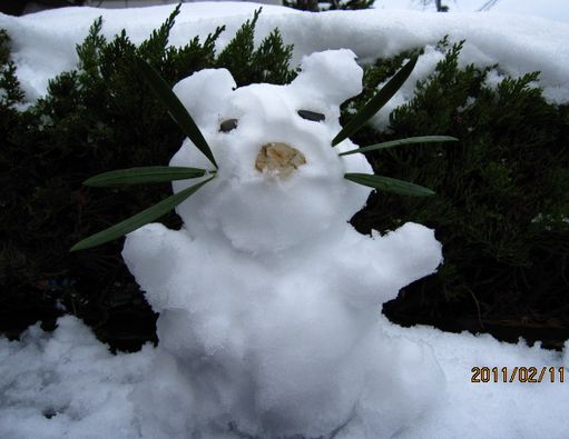 ちょっと雪で遊んでみました。何に見えます??玄関の門(ゲート)の上で娘と息子をお出迎えしています。もう一方には、小型雪ダルマを作りました。