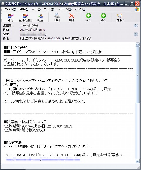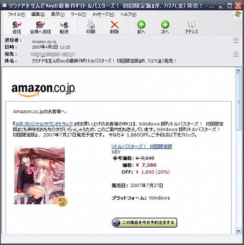 昨日とはうって変わっての晴天で、とても音夢くなってくるポカポカ陽気でしたがやはり屋外の様子はホコリっぽい・・・と言うか黄砂!どう見ても黄砂です、本当にありがとうございました。おかげで玄関ポーチ回りのタイルは汚れまくり、屋外に置いてある様々な"モノ"は砂まみれになってました。黄砂逝ってよし!(ぉとりあえず花粉はそこそこ一段落したかのようでしたが、朝方の気温の低さはちょっと頂けませんね。起きにくいことこの上なし。そんなわけで三日坊主は脱したよつばとひめくりと共に水曜の徒然。・Amazonのおすすめメールにやられて早まった真似を(ryAmazonからのおすすめメールがあまりにもツボを付きすぎているのはこのBlogでもよく取り上げるとおりですが、先日もこんなメールが。まぁ発売日は知ってましたがあまりにタイムリー。Key/VisualArt's作品で樋上いたるを初めとしたスタッフ陣と来たらもう買うしかないじゃないか!と・・・・・・・・・・・・1,000,000本注文した!予 約 完 了 k t k r wwwそんなわけで智代アフターはいろいろあってスルーしましたがCLANNADを2004年になぜかR-18な売り場に陳列していたヤマギワソフト館でサクッと購入して帰りのエスカレーターでタグはずし忘れのおかげでブザー鳴りまくってCDフロアで店員に中身を検めさせた甘酸っぱい思い出から数年、何ともあっけなく予約してしまったのでした。ちなみに他に購入したのは予定通り、涼宮ハルヒの分裂と、どことなく一緒にかごに入れたまなびストレート!(1)の2つ。まぁ井上麻里奈さんサイン入りポスターも貰ったんだしお布施しとくか、と(w注文後しばらくしてから、ペイジーの支払い番号来ないなぁとアカウントサービスにログインして注文状況を確認すると・・・な ん な ん で す か ー ? (w先月末予約開始したばかりのリトルバスターズ!が来週末には配送されて、分裂とまなびは「まもなく発送」なのに配送予定日は28年~72年前ですが。Amazonはいつからタイムマシンを導入したんでしょうね?というか過去に配送されたところで管理人はいませんけど。朝比奈さんに頼んで時間遡行を(ryボケはこれくらいにしますが、一向にメール来ないので何だかなぁと。注文履歴を漁ってみると所々配送予定日が狂った注文が見受けられるので、先日の楽天Blogのシステム障害と似たような状態なのかもしれません。年度初めの処理でどこかが転けているんでしょうね。どうも注文の支払い情報が代引きになったままだったのでペイジーに変更しましたが、見かけ上はペイジーになってても結局さっき来たメールでは元の支払い方法で分割発送されてしまった模様。くそぅ、今度からはペイジーをデフォで使うように設定変更しないと。でも1-Click設定OFFにしてあるんだけどなぁ・・・。他にあきばんぐでDVD-Rも注文し、こちらはすでに発送完了の連絡も入ったので数日後には到着見込み。今回はやたら買い物した感じがしますが、パソコン改造記はリトルバスターズ!を大げさ且つ大々的に応援しています(ぇ・弟のFOMA P903i(オレンジ×オレンジ)をサクッと試してみたP901iSを使っていた弟がP903iに機種変更したので、適当に触ってみました。まず気付くのはレスポンスの大幅な向上。P901iSは何をするにも待たされ、もっさりにも程があるだろう!!!と投げたくなるほどの遅さでしたが、P903iは劇的に改善。iモードメニューを開いてiメニューに到達するまでも、ずいぶん待ち時間が短くなりました。と言うよりどう見てもサクサク。ランチャーアイコンやメニュー階層も変更され、Flashベースになりました。・・・なんかF902iSでメニューを操作しているような感じが(汗普通のランチャーアイコンのほうが使いやすそうな気がしますが、これは設定でどうにでもなりそうな希ガス。メイン液晶の大型化は大歓迎です。microSDなのはいただけませんが、キー照明がホワイトLEDになってたのはなかなか印象的でした。そしてP903iの目玉、あんしんキーですが結構距離取らないとロックかからないんですね。初期設定はあんしんキーの電池蓋の中にあるIDシールの4桁の数字をP903iの設定から入力し、電池を戻してあんしんキーのスイッチを入れて設定完了。さながらコードレス電話機の子機増設登録ですねぇ。あとはあんしんキーロックをONにすれば、スイッチを入れた状態でキーからP903i本体が離れると自動でロックがかかるようになります。距離の感度設定は3段階で選べますが、一番短くしても6畳和室だとどこにキーを置いてもロックがかからず、他の階にキーを移動したところやっとロックがかかりました。ちなみにあんしんキーのスイッチをOFFにしておけばすぐロックがかかりますが、その場合はP903iであんしんキーロック設定をOFFにするように記載されています。まぁあんしんキー自体使わない設定もあるので、弟はそっちで使うみたいですけどね。・WGA NotificationsによるXP SP2へのアップグレード催促ドナドナ先の決まったPCを現在リカバリ・Windows Update中ですが、