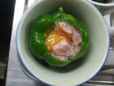 これはNHKテレビテキストきょう料理2月号に載っている。びっくりピーマンエッグを参考に私が作りました。物凄く美味しいので(失敗したけど、^m^)~~ご紹介します。(自分の写真を使うなら、掲載も大丈夫という許可もとっています)卵白を、入れすぎました1.ピーマンのヘタの部分をビンのフタでくりぬきます。2.卵は、卵黄と卵白に分けて、卵白の方には塩、胡椒少々、ハム(私の場合はソーセージ)を細かく刻んで混ぜておく。3.ピーマンを湯飲みなど(茶碗蒸しの器でも)に入れ、スプーンで2の卵白を 大匙11/2ぐらい入れ、卵黄を乗せ楊枝などで卵黄をつつく。 残っていた卵白をピーマンの8分ぐらいまで入れ、軽くラップして1分ぐらい(500w場合)レンジでチン。*私の場合は卵白を入れすぎました~~8分ぐらいよいですよ~~^^*加熱は卵がほぼ固まる程度、加熱しすぎるとこぼれてしまいます~~それと、卵黄は 破裂防止のために必ず、楊枝などでつつく。4.後はフライパンにサラダ油をひき、ピーマンに焼き色つくまで焼いて出来上がり。 見事な~~失敗作ですぅ~~(笑)レンジで加熱し過ぎています~~卵白も入れ過ぎてしまいました(>_<)本来は卵は半熟状態です失敗したけど^^ でも、これはこれなりに美味しかったよ好みでケチャップをかけても^^ このレシピは2月にNHK教育テレビで放送されると思います??たぶん!!